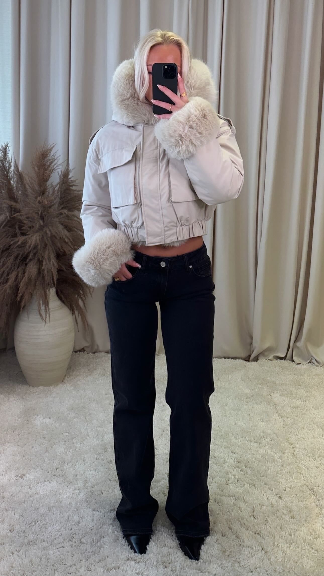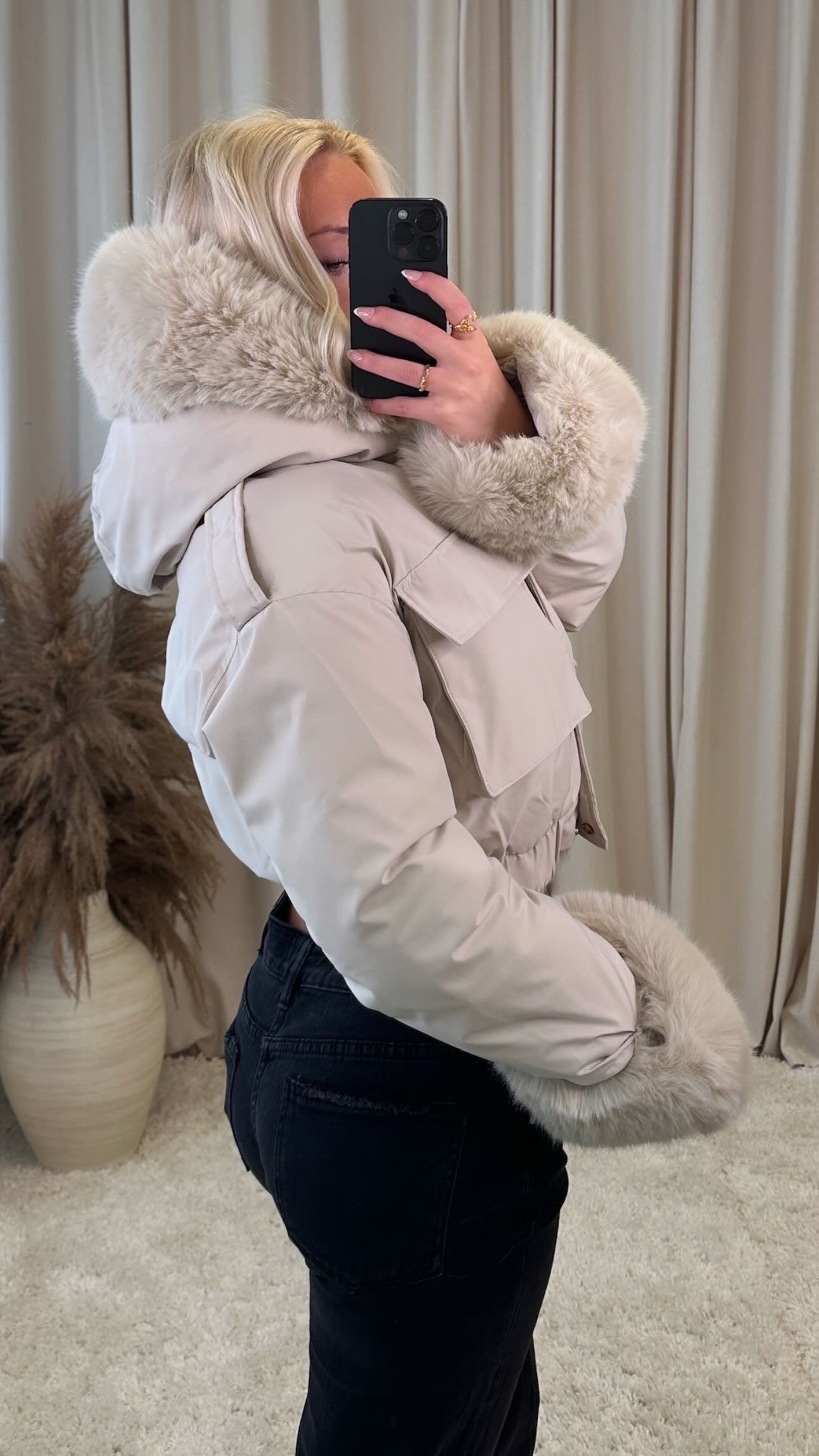Stutt úlpa með hettu. Loð er á hettunni og ermunum sem hægt að að taka af.