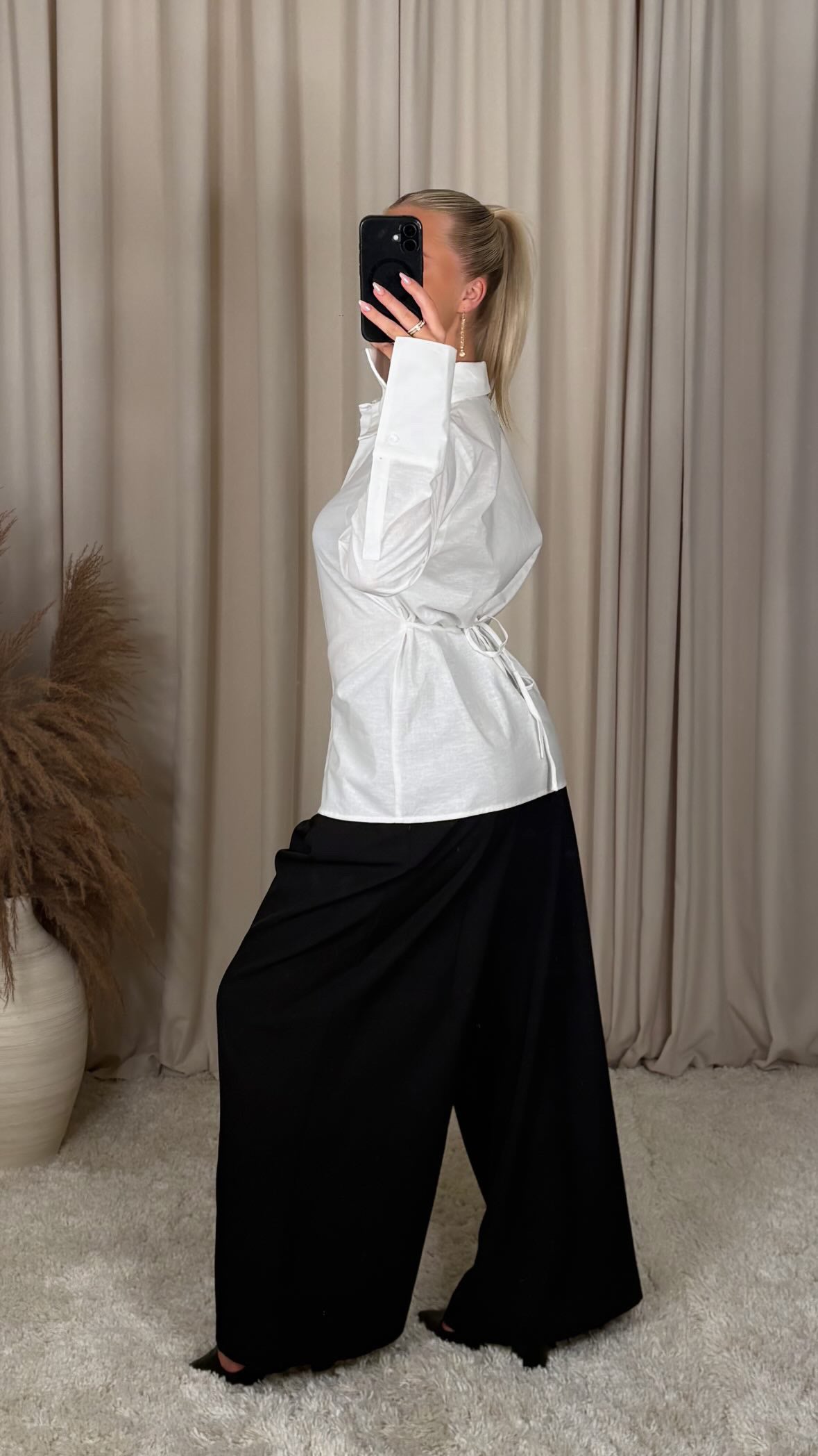 Falleg og tímalaus skyrta með aðsniðnu mitti sem mótar líkamann og skapar kvenlegt og elegant snið. Skyrtan er bundin að aftan, sem gerir þér kleift að stilla mittið og fá fallega lögun. Hún er með klassískum kraga, hnappalokun að framan og síðum ermum með víðum ermum neðst sem gefa henni fágað og smart útlit.
