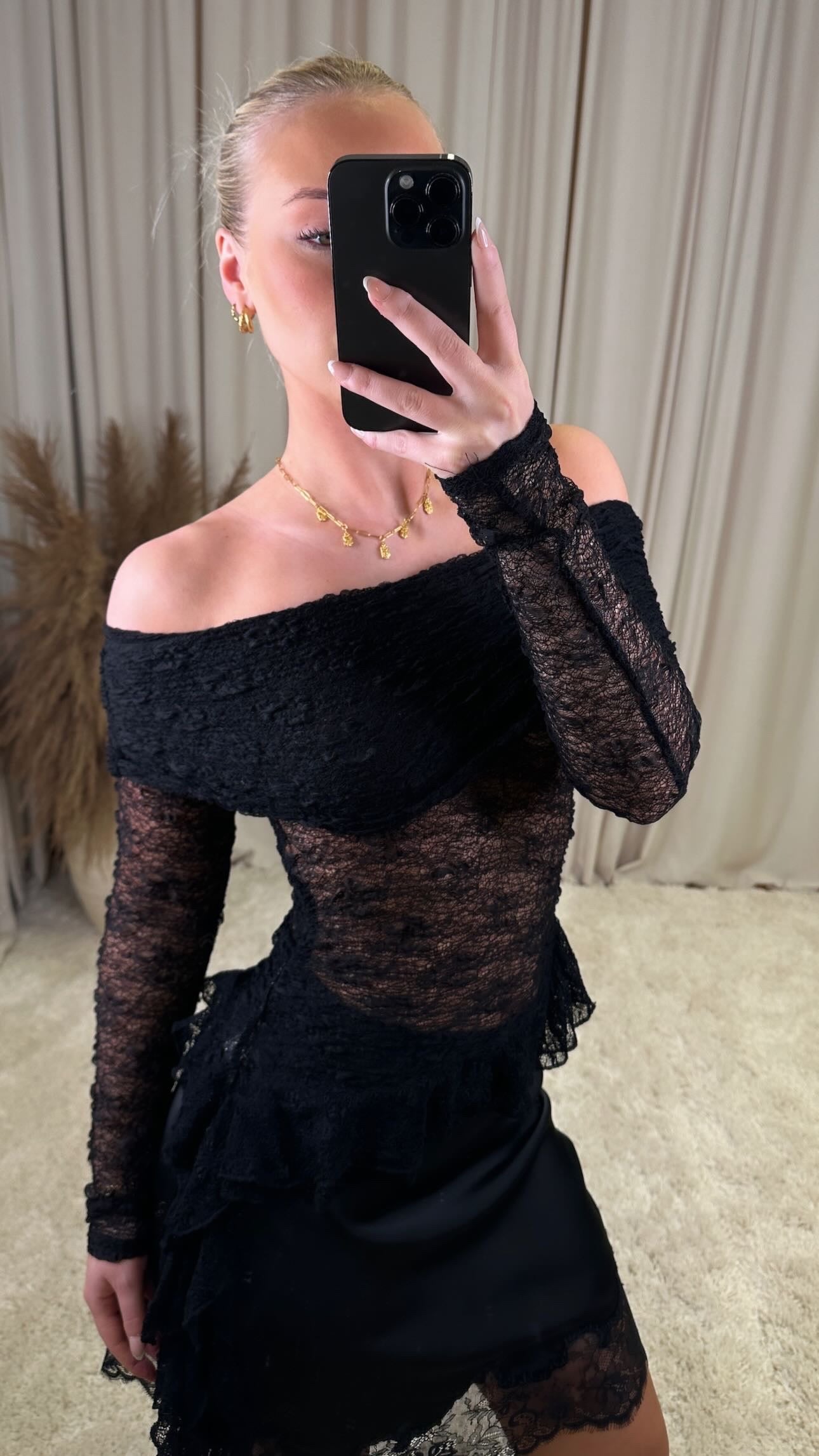 Æðislega fallegur off shoulder bolur úr mjög þæginlegu blúndu efni, það er smá teygja í efninu