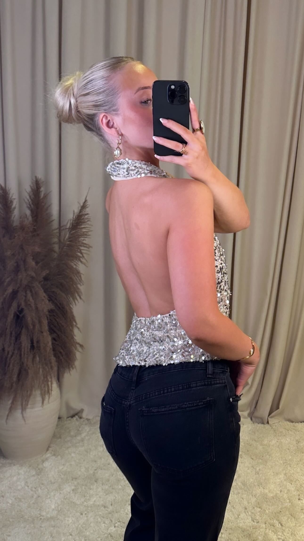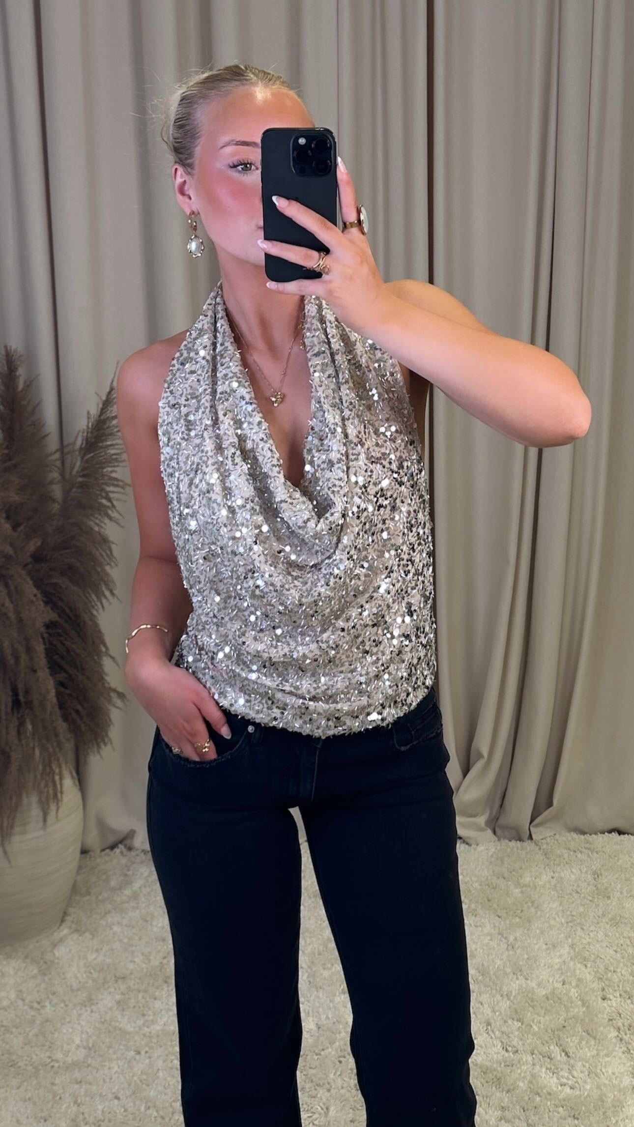 Æðislega fallegur pallíettu bolur úr mjög þæginlegu efni, það er góð teygja í efninu og er með tvöfalt efni þannig að pallietturnar eiga ekki að stinga í gegn