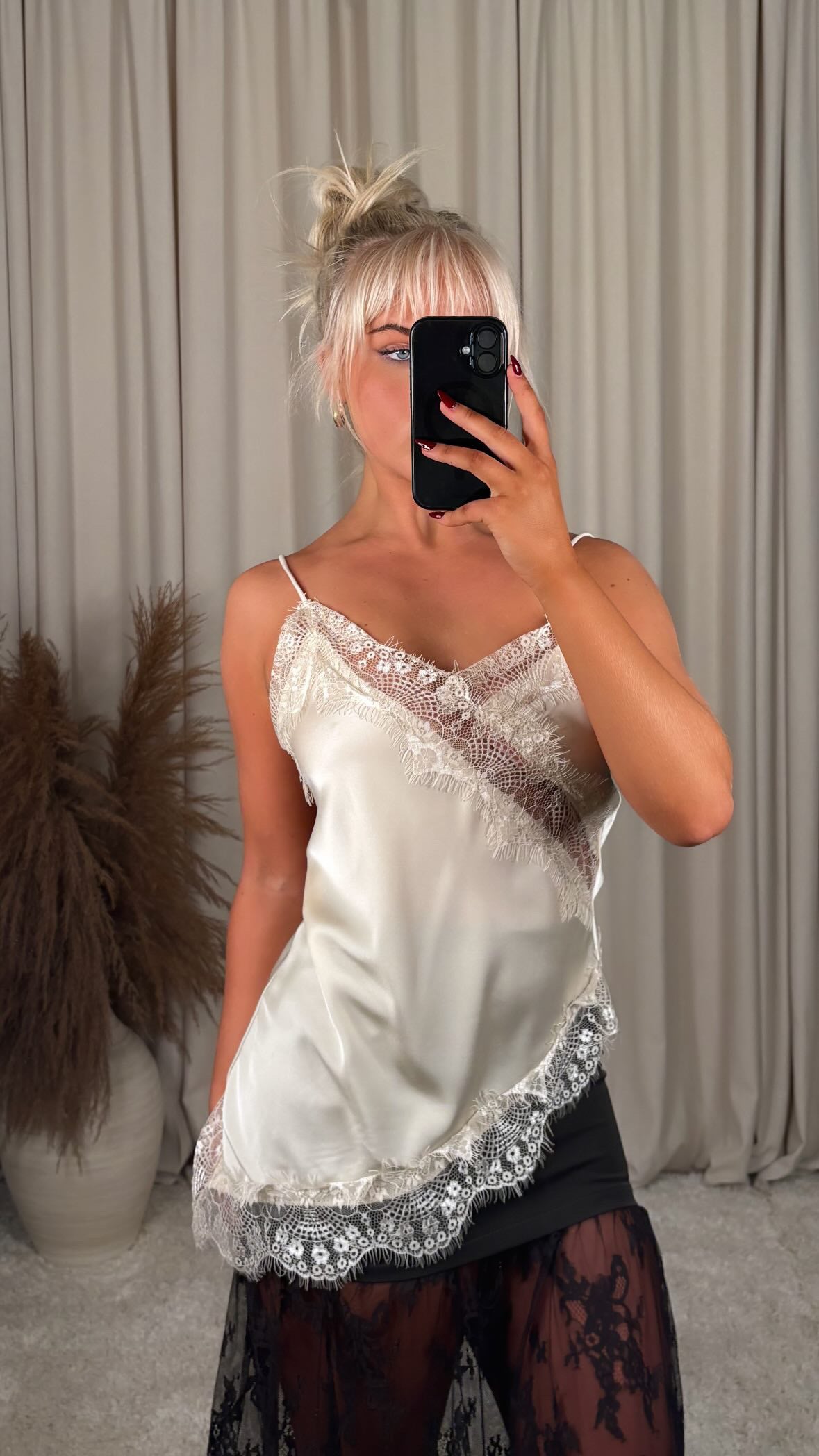 Æðislega flottur blúndu bolur úr mjög mjúku satín efni, það er engin teygja í efninu og er true to size