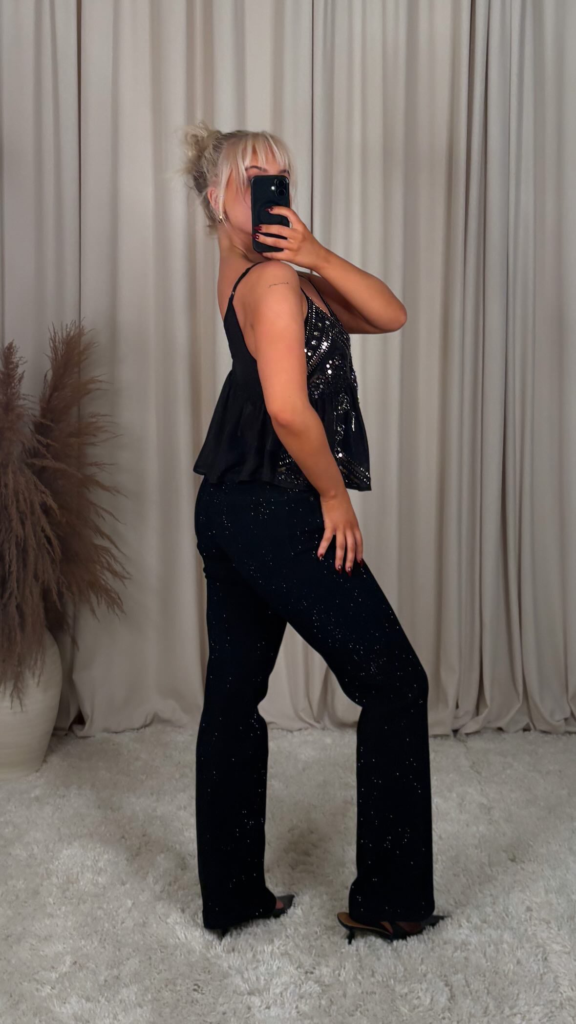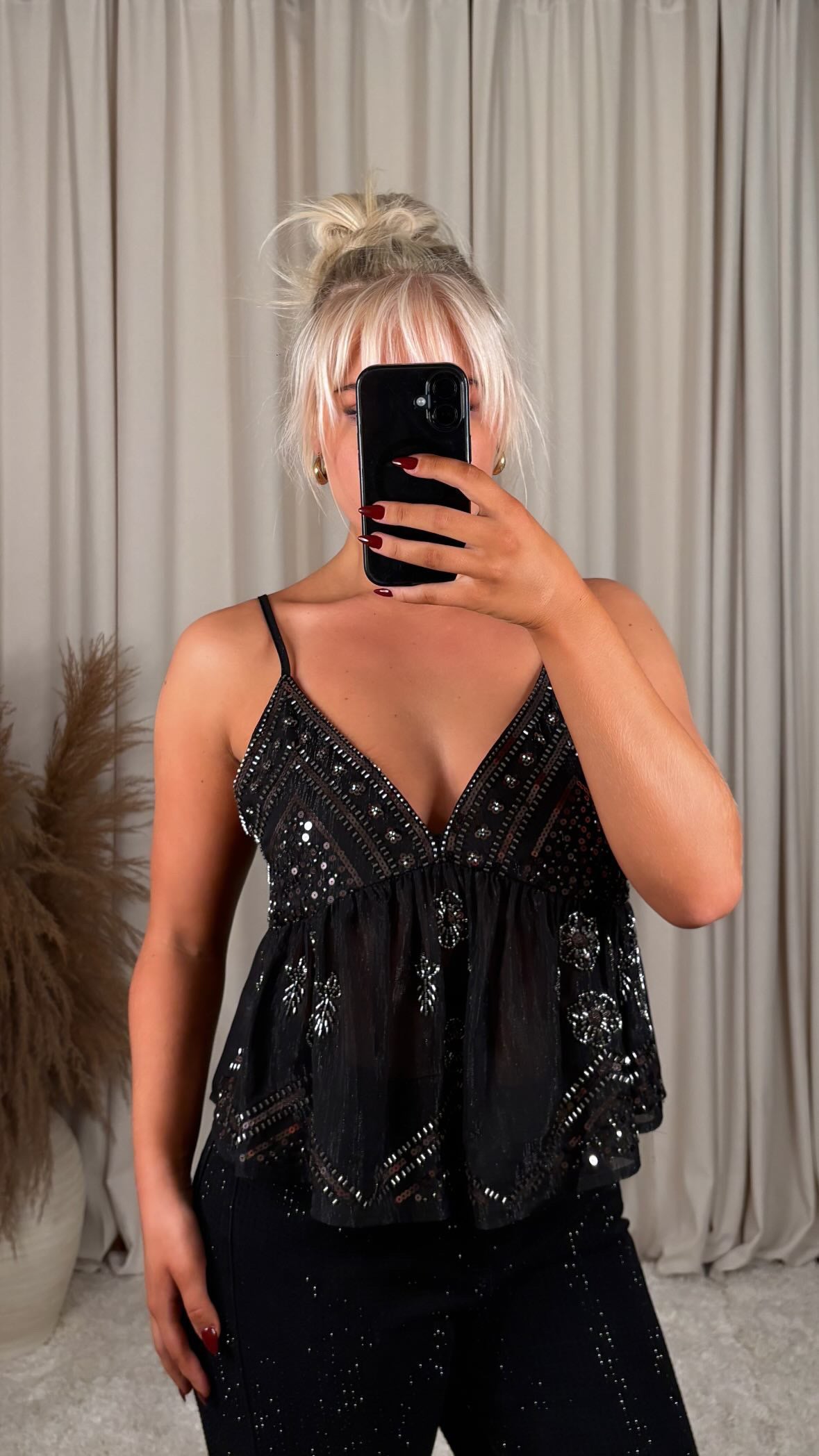 sjúklega fallegur pallíettu bolur úr mjög þæginlegu chiffon efni, það er engin teygja í efninu
