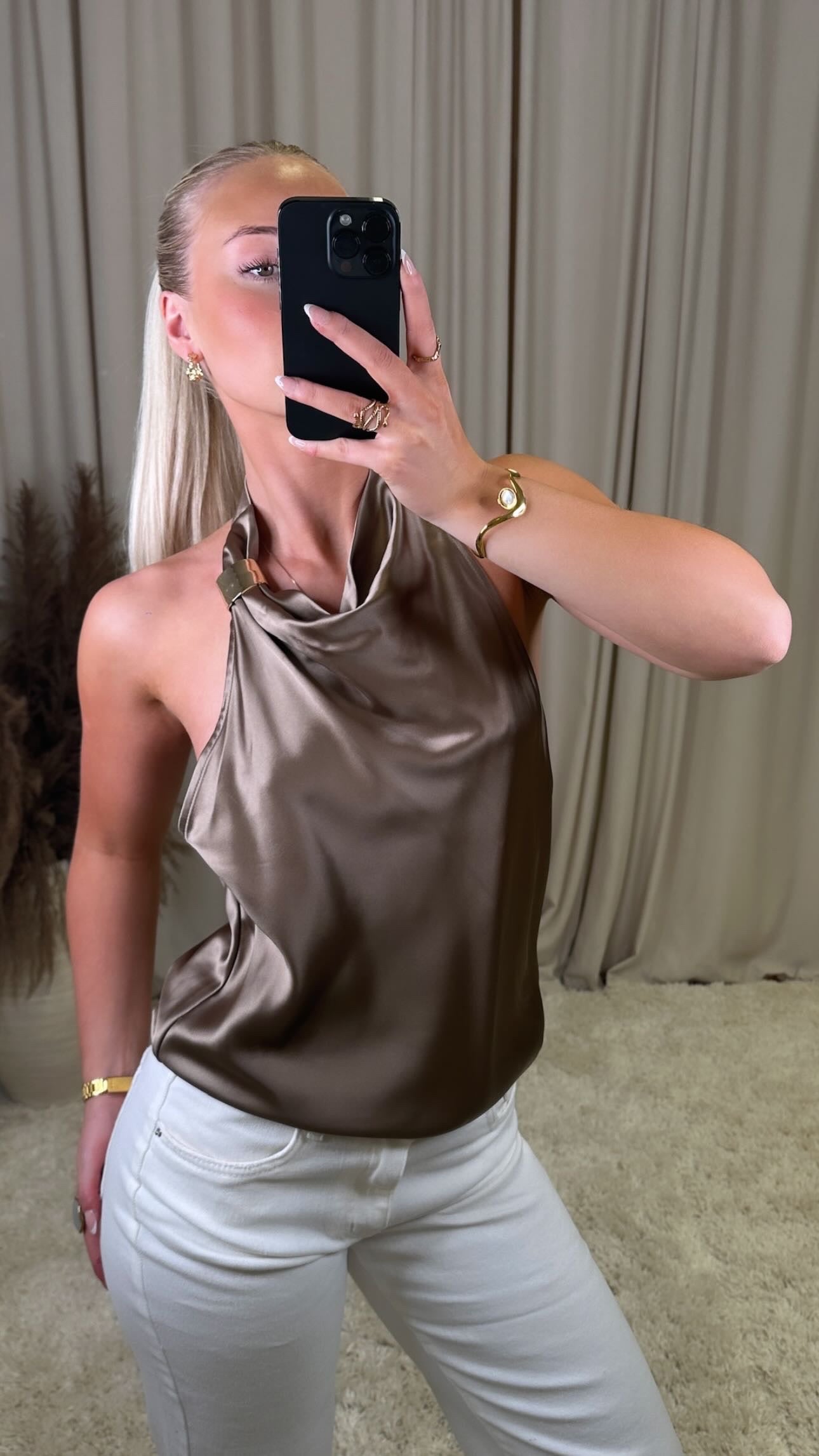 Æðislega fallegur bolur úr mjög mjúku satín efni, það er engin teygja í efninu og er hneppt um hálsinn