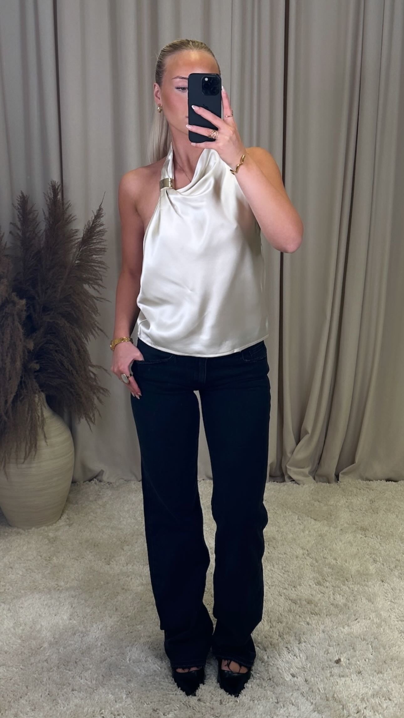 Æðislega fallegur bolur úr mjög mjúku satín efni, það er engin teygja í efninu og er hneppt um hálsinn
