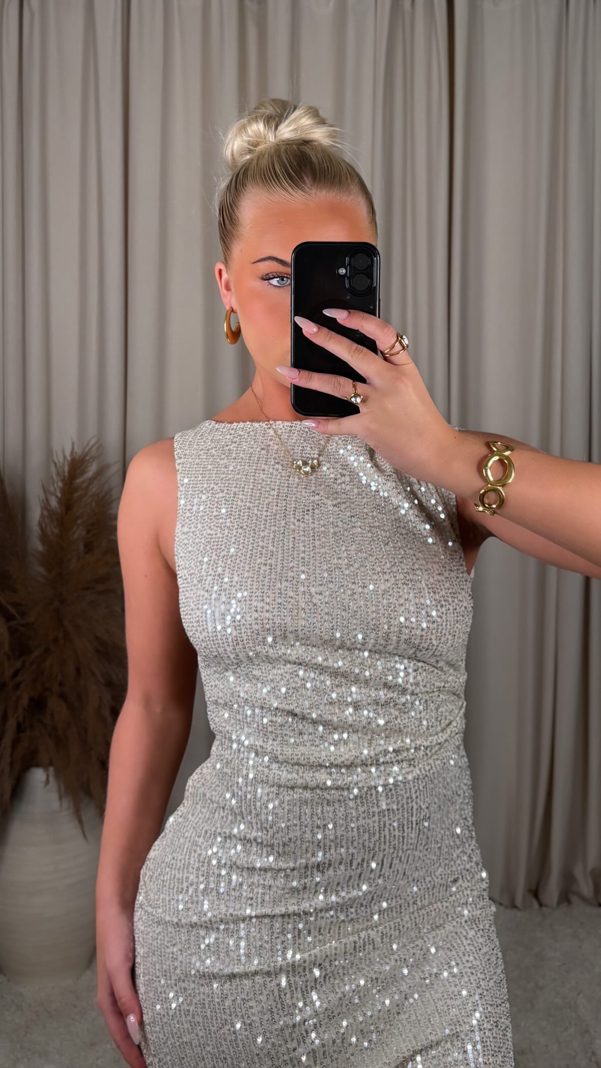 Æðislega fallegur pallíettu kjóll úr mjög þæginlegu efni, það er smá teygja í efninu og er með tvöföldu efni þannig að pallietturnar stinga ekki í gegn, það er rennilás á hliðinni