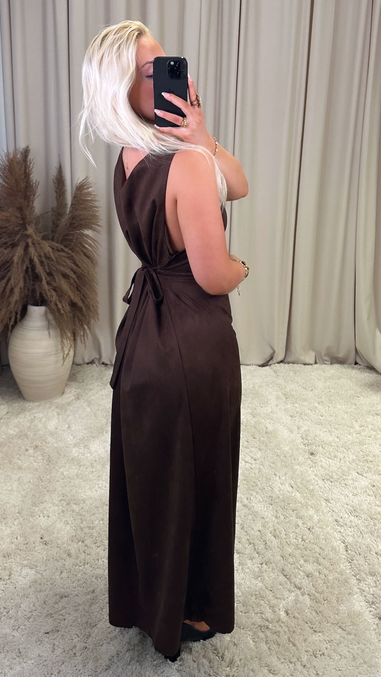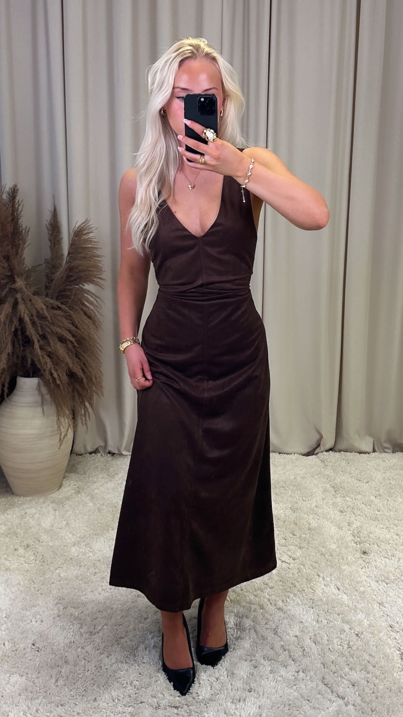 Æðislega fallegur kjóll úr hágæða vegan rúskinni, það er engin teygja í efninu og er bundin um mittið