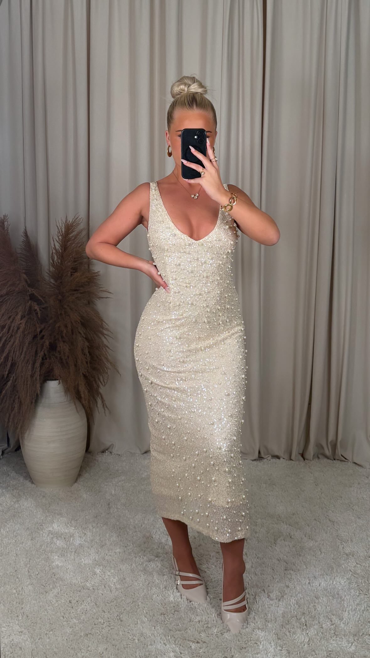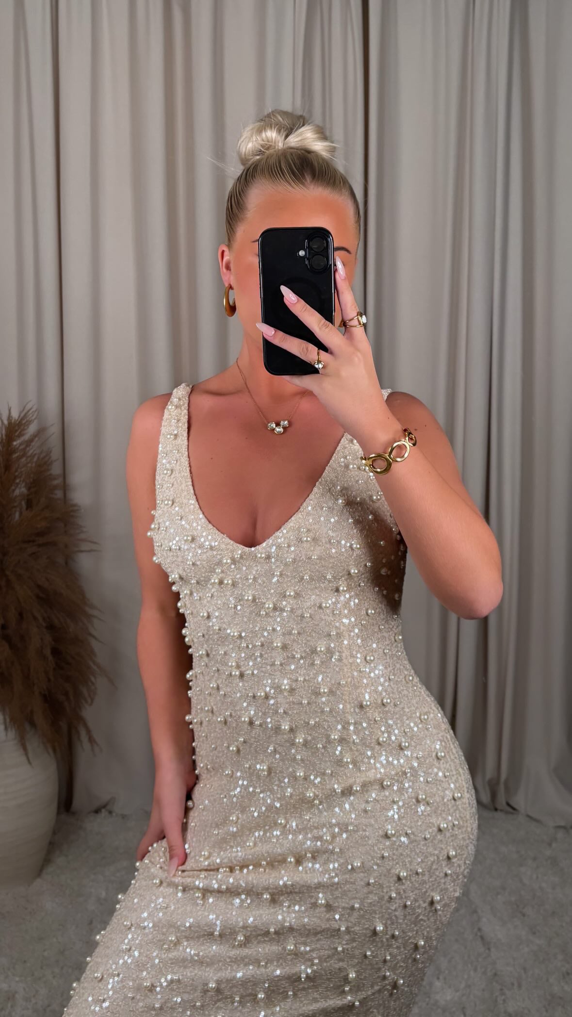 Æðislega fallegur pallíettu kjóll með perlum, það er góð teygja í efninu og er með rennilás að aftan