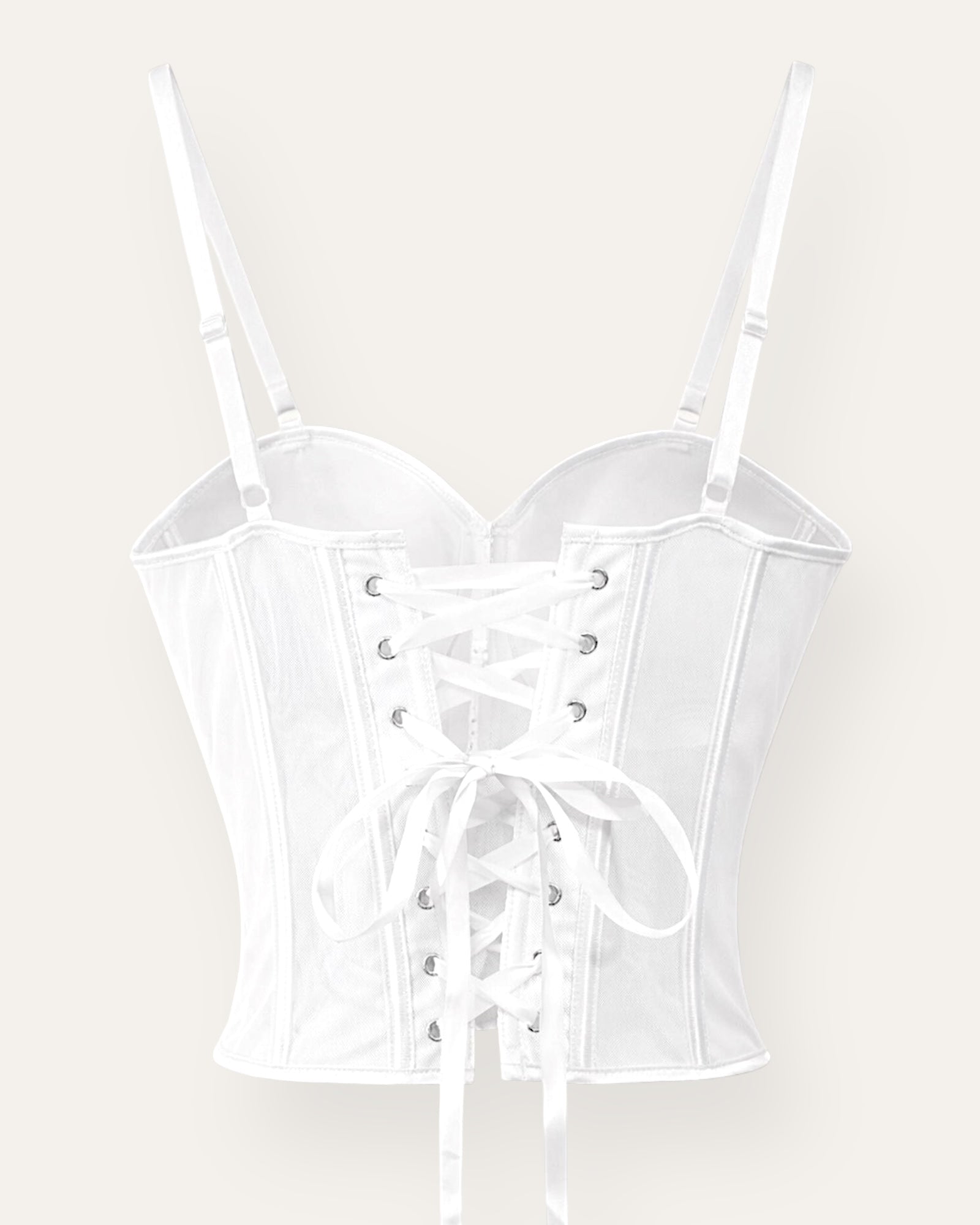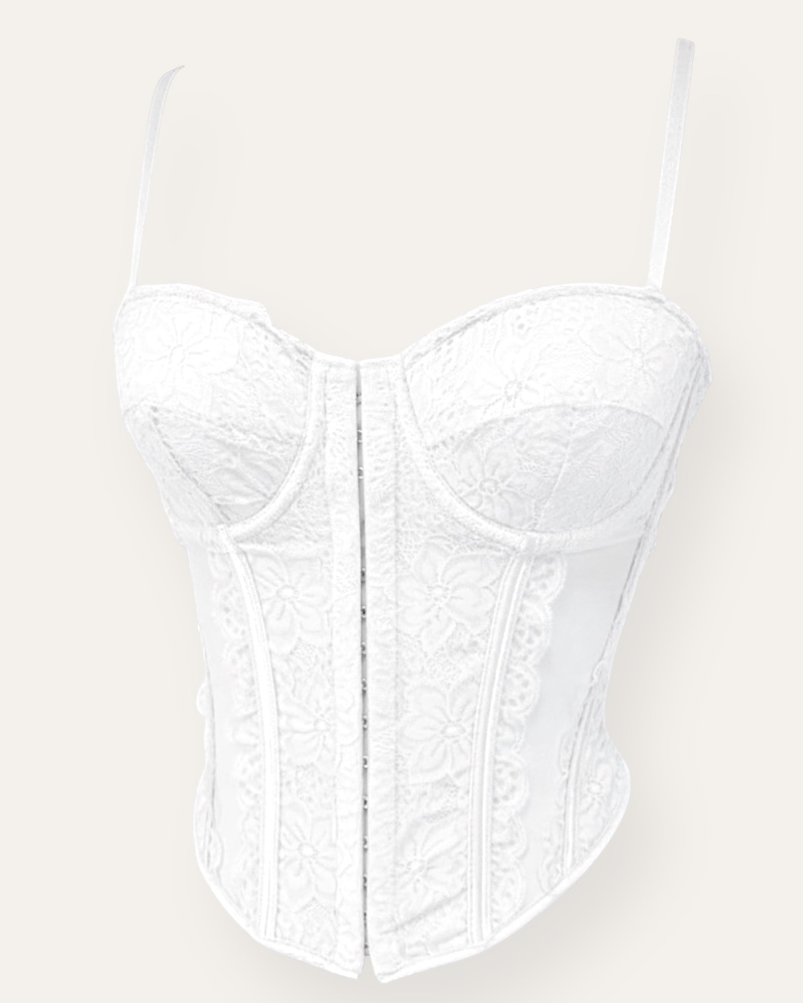 Fallegur og kvenlegur corset toppur með blúnduáferð sem mótar líkamann og gefur elegant útlit. Toppurinn er með stillanlegum hlýrum og klassísku corset sniði sem leggst fallega að mittinu.