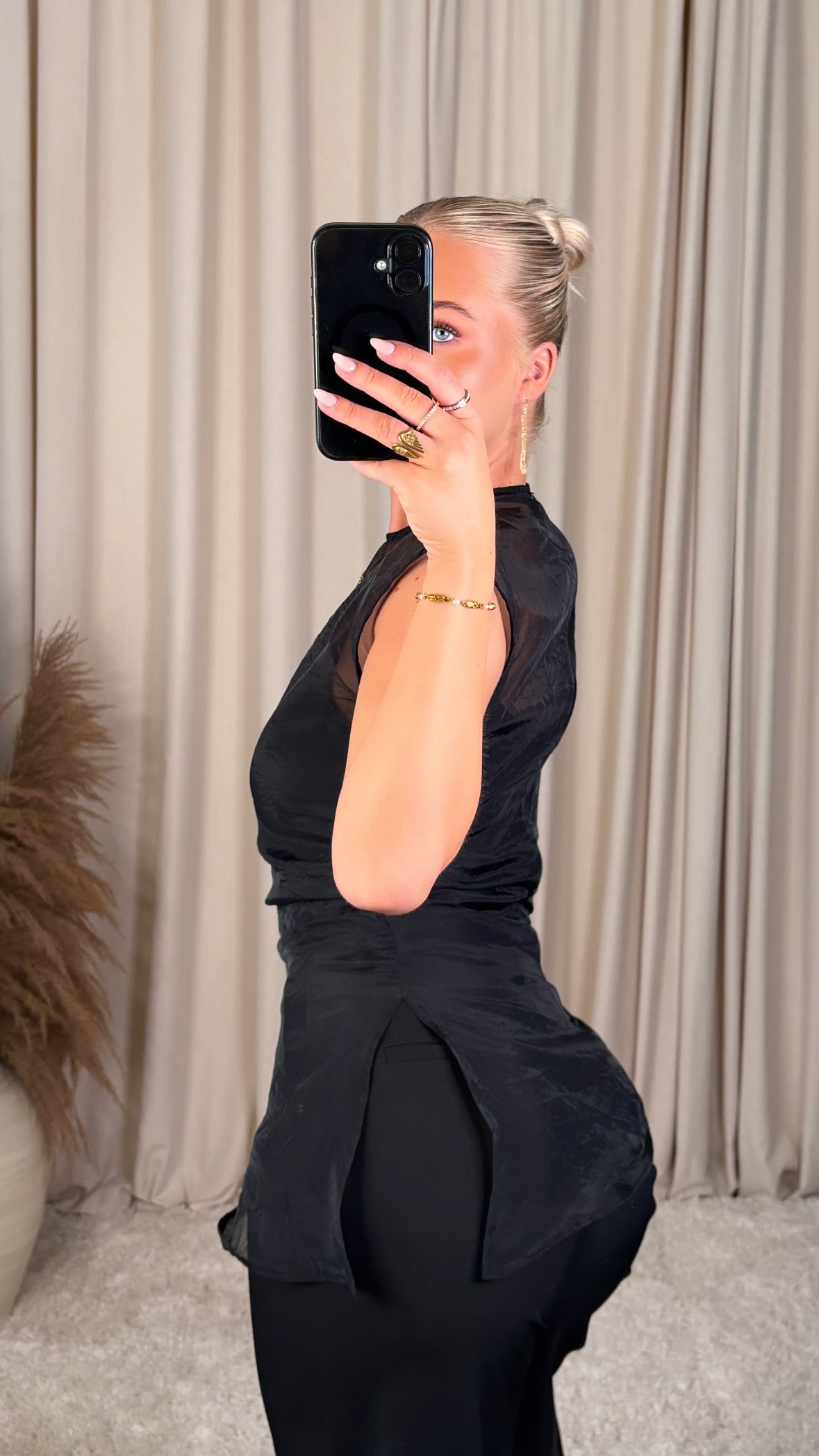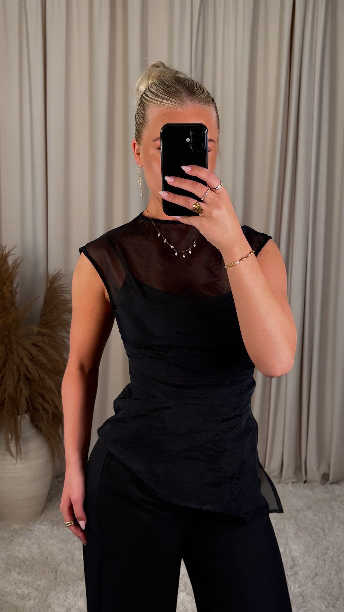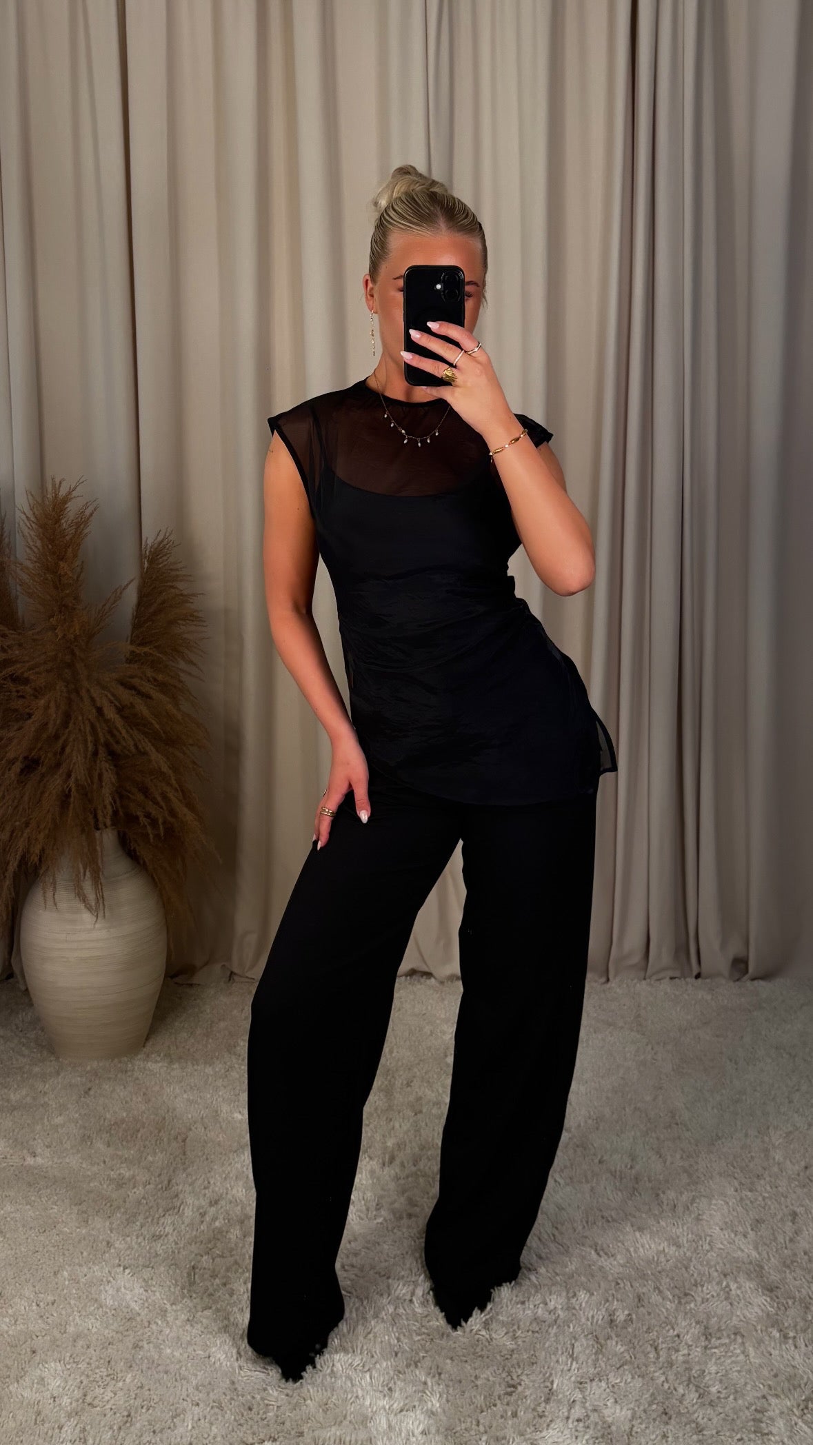 Léttur og elegant see-through toppur sem gefur outfittinu strax trendy og fágað look. Toppurinn er úr mjúku, gegnsæju efni með fallegu flæði sem leggst létt að líkamanum.