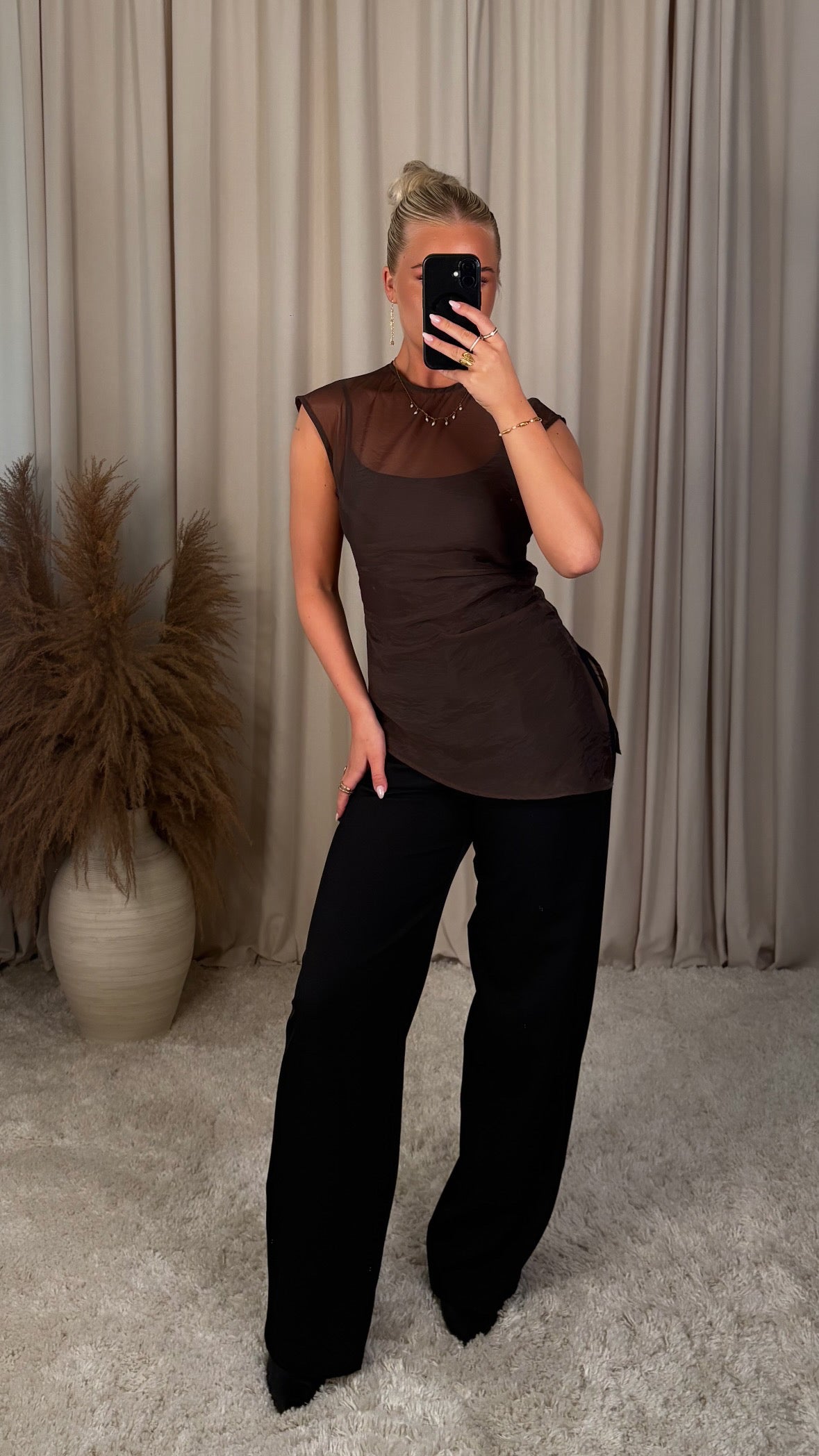 Léttur og elegant see-through toppur sem gefur outfittinu strax trendy og fágað look. Toppurinn er úr mjúku, gegnsæju efni með fallegu flæði sem leggst létt að líkamanum.