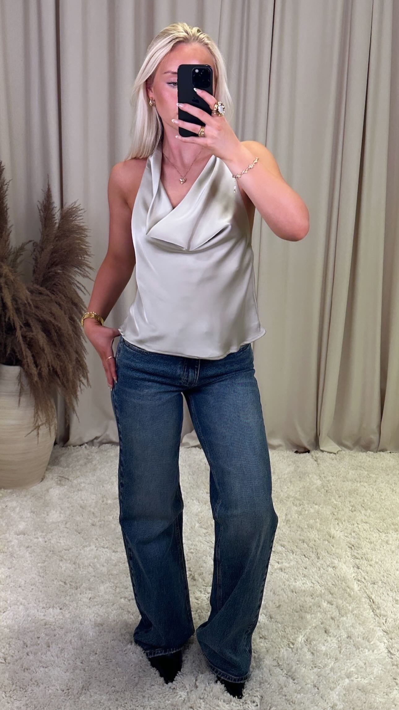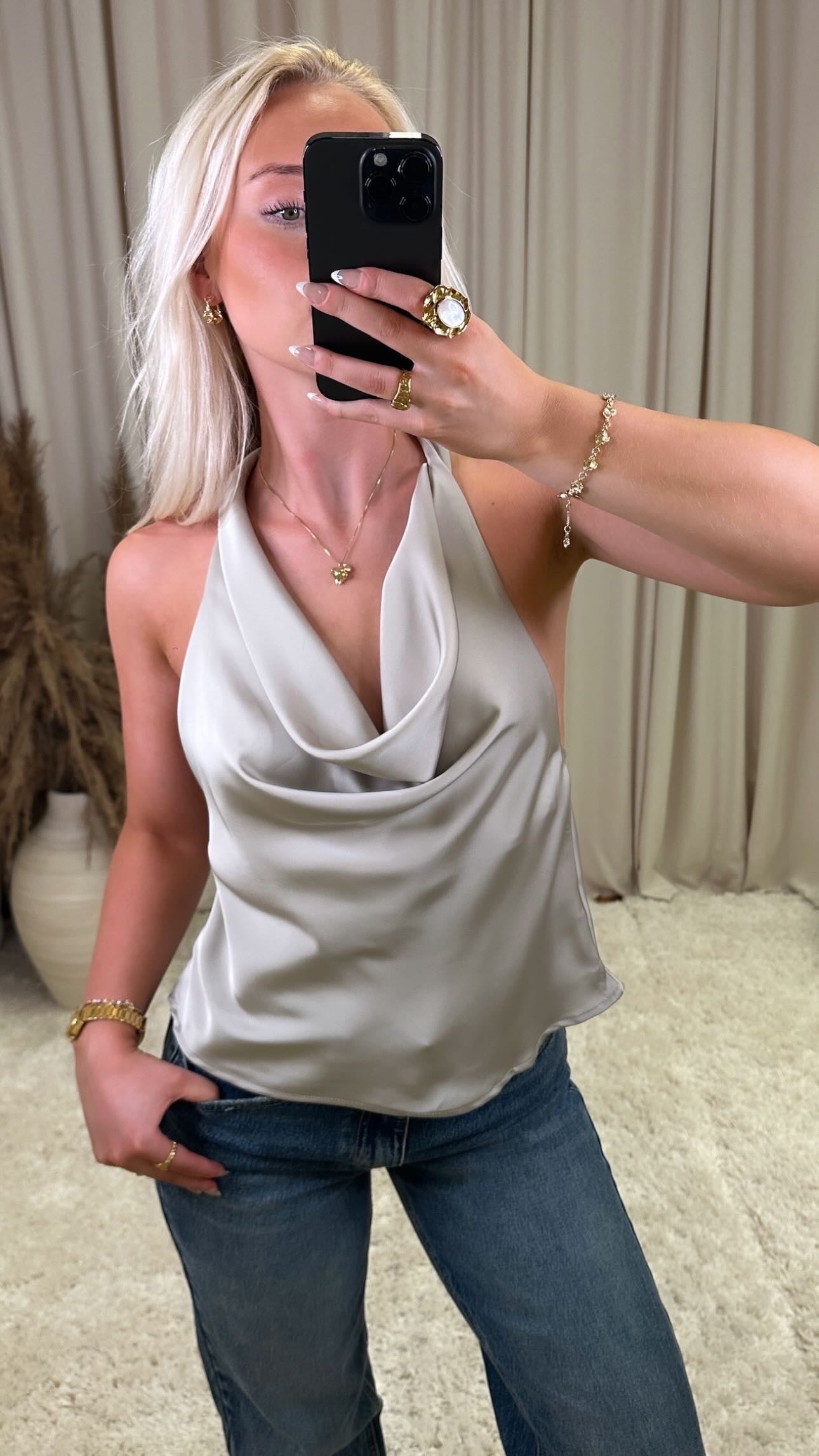 Æðislega flottur bolur úr mjög mjúku satín efni, það er engin teygja í efninu og er opin í bakið