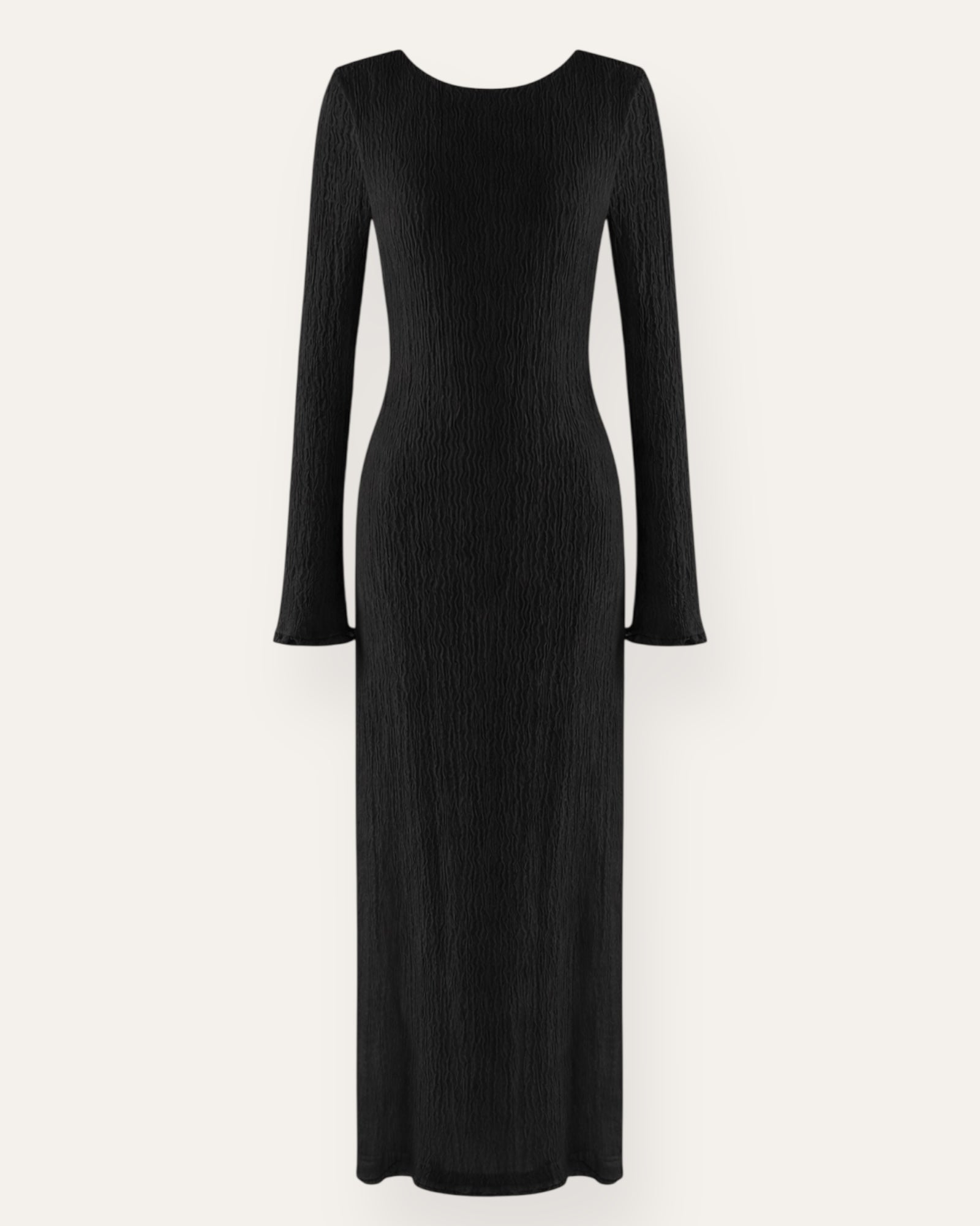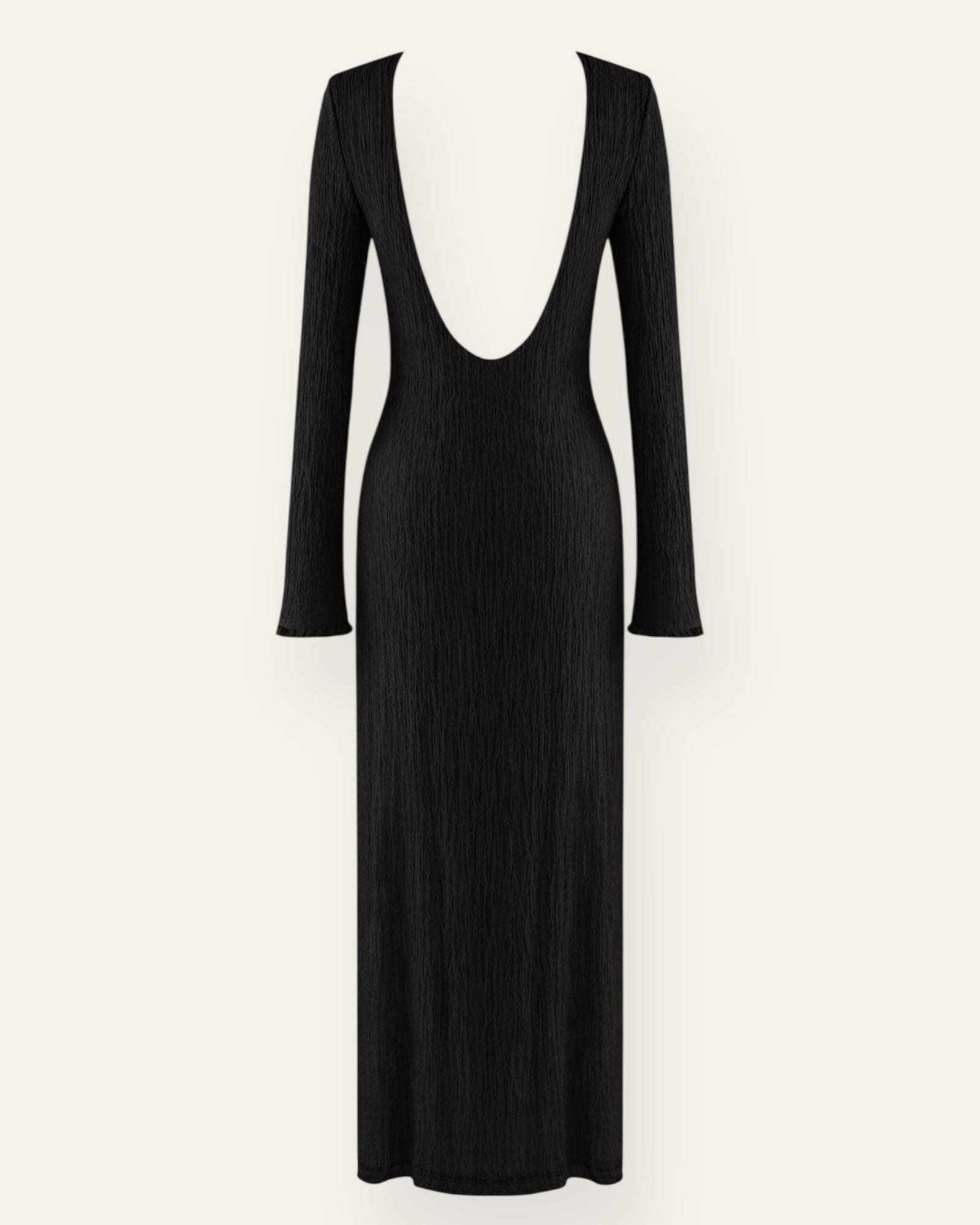 Fallegur og kvenlegur maxi kjóll með síðum ermum og djúpu opnu baki sem gefur honum glæsilegt útlit. Efnið er mjúkt og teygjanlegt með fallegri áferð sem fellur vel að líkamanum. Fullkominn fyrir veislur, kvöldverði eða þegar þú vilt klæða þig aðeins upp.