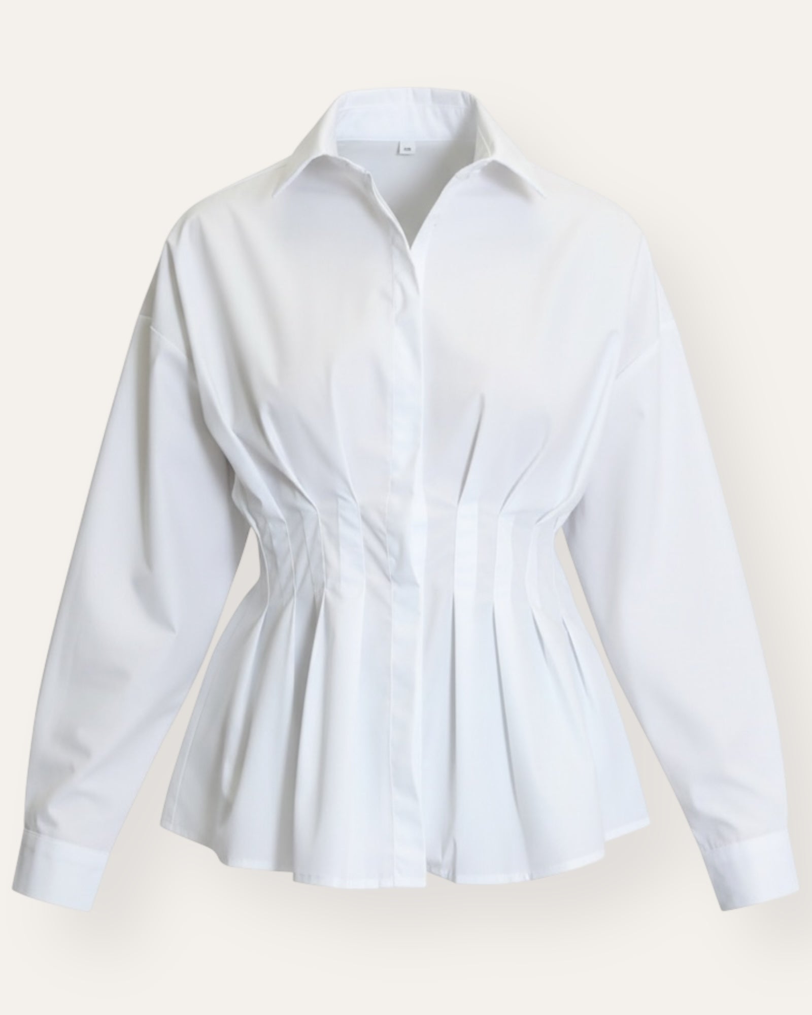 Stílhrein hvít skyrta með klassískum kraga og löngum ermum. Fallegar fellingar í mittinu móta skyrtuna og gefa henni kvenlegt og elegant snið.