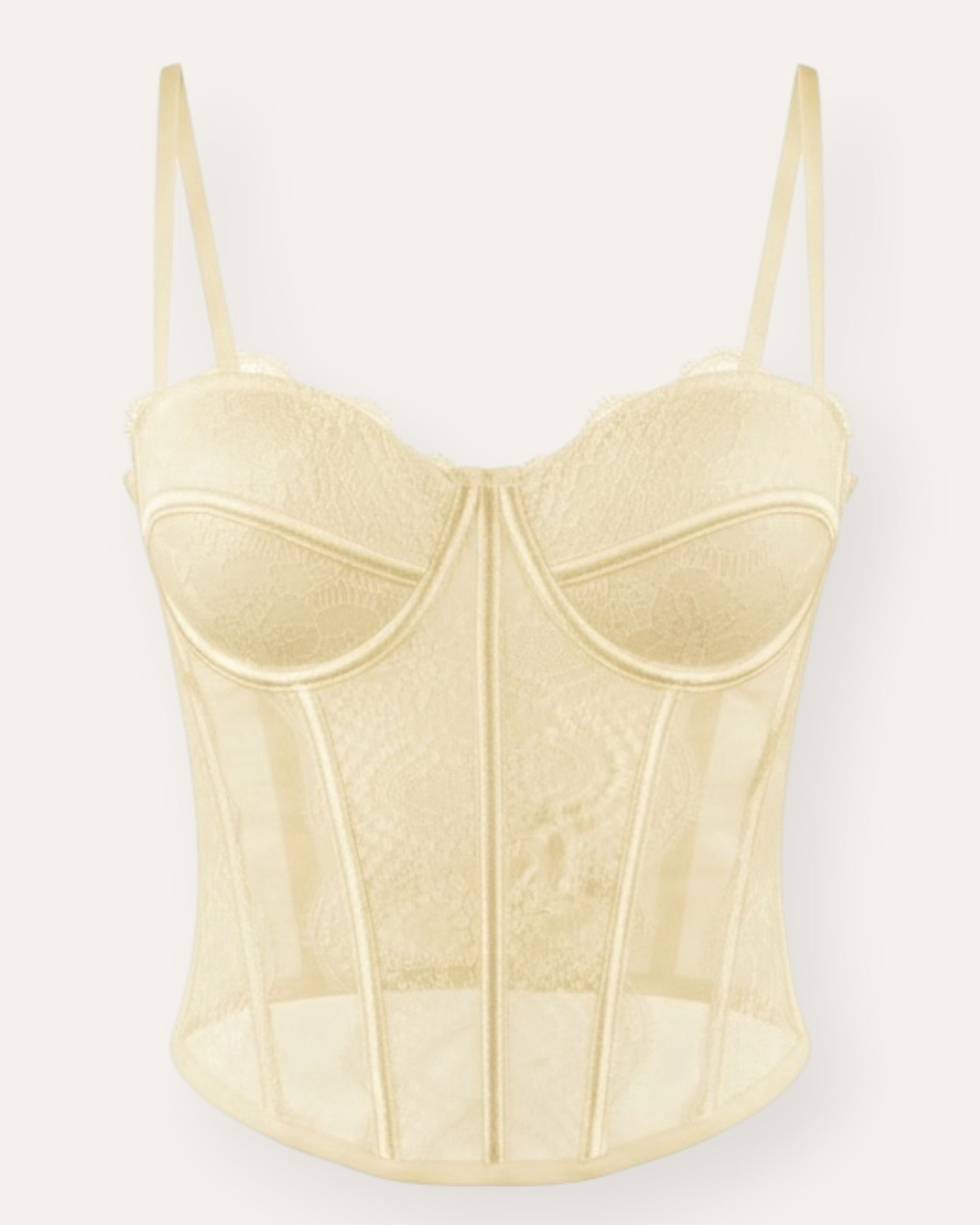 Fallegur og kvenlegur corset toppur sem mótar líkamann á glæsilegan hátt. Toppurinn er úr mjúkri, hálfgegnsærri blúndu með fallegum saumum sem gefa honum lúxus útlit. Hann er með stillanlegum hlýrum og styrkingu (boning) sem heldur formi og veitir góðan stuðning.