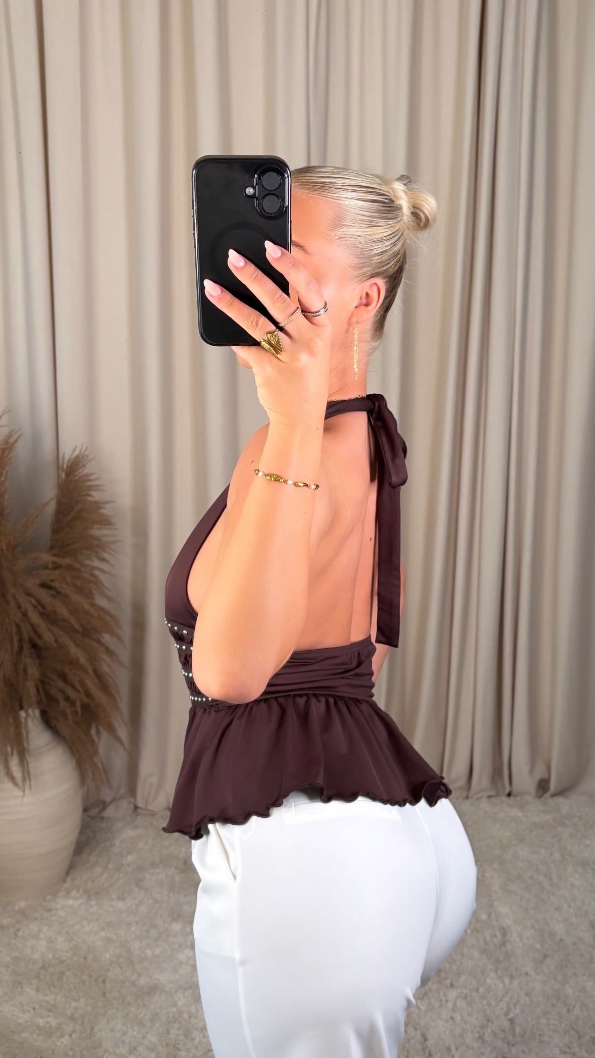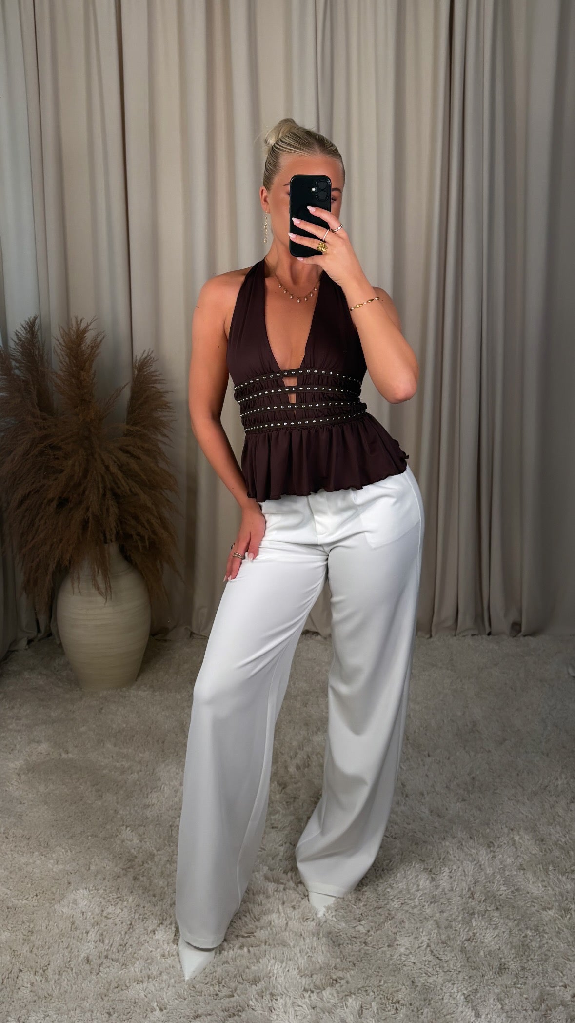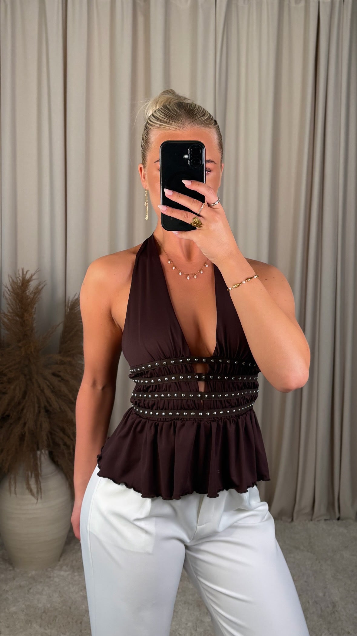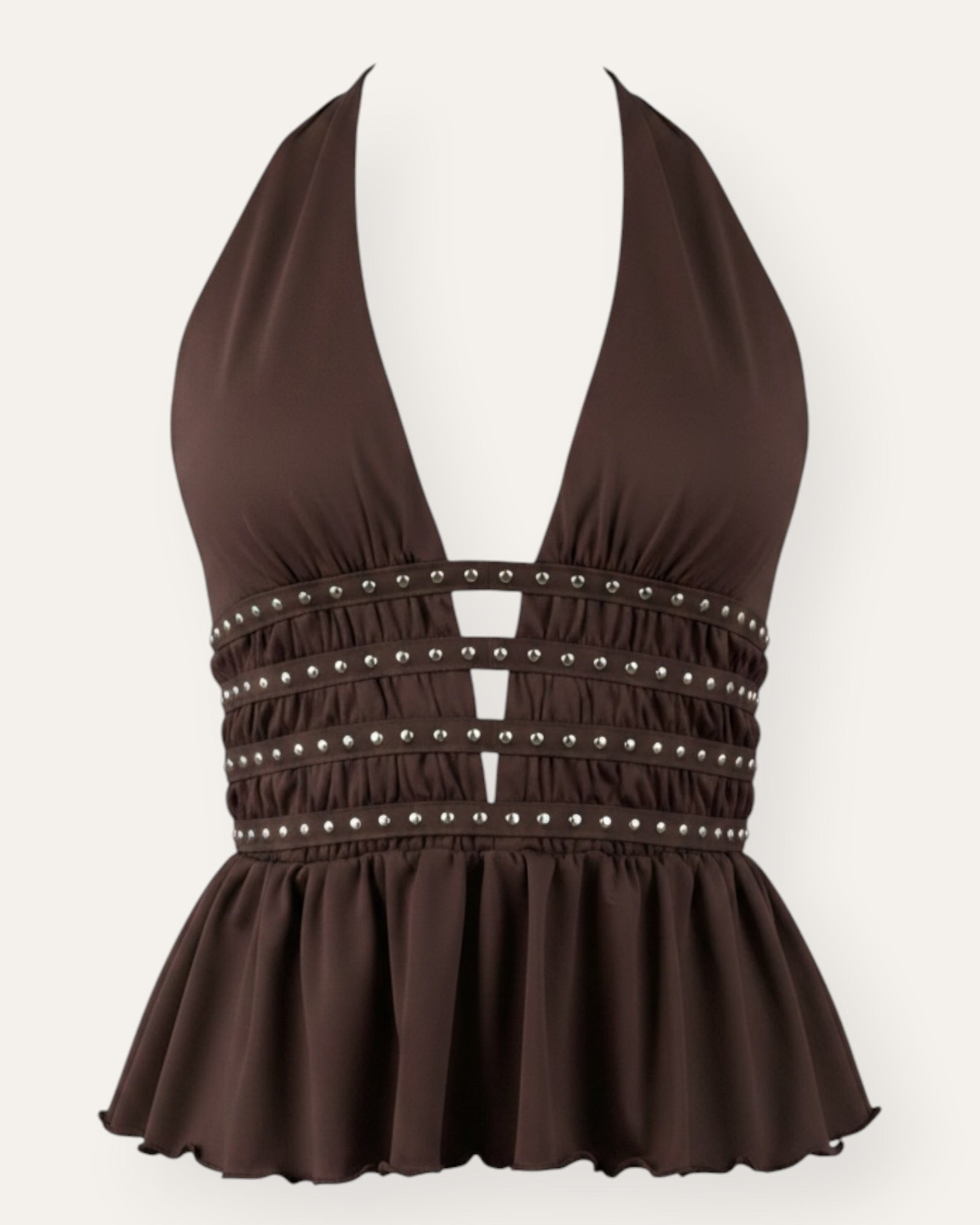 Djarfur og töff halter toppur sem tekur outfittið á næsta level. Toppurinn er með djúpu V-hálsmáli og opnu sniði að framan sem leggur áherslu á formið, ásamt fallegum “studs” smáatriðum sem gefa edgy og lúxus vibe.