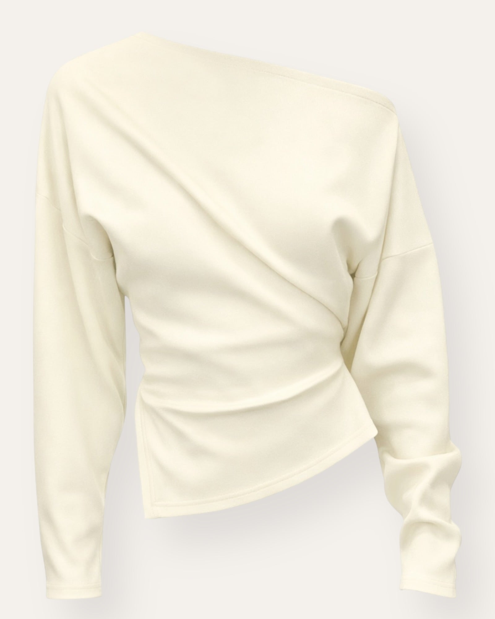 Fallegur og stílhreinn toppur með off-shoulder sniði sem leggst fallega yfir axlirnar. Toppurinn er með löngum ermum og mjúku efni með fellingum sem móta mittið og skapa kvenlegt snið.