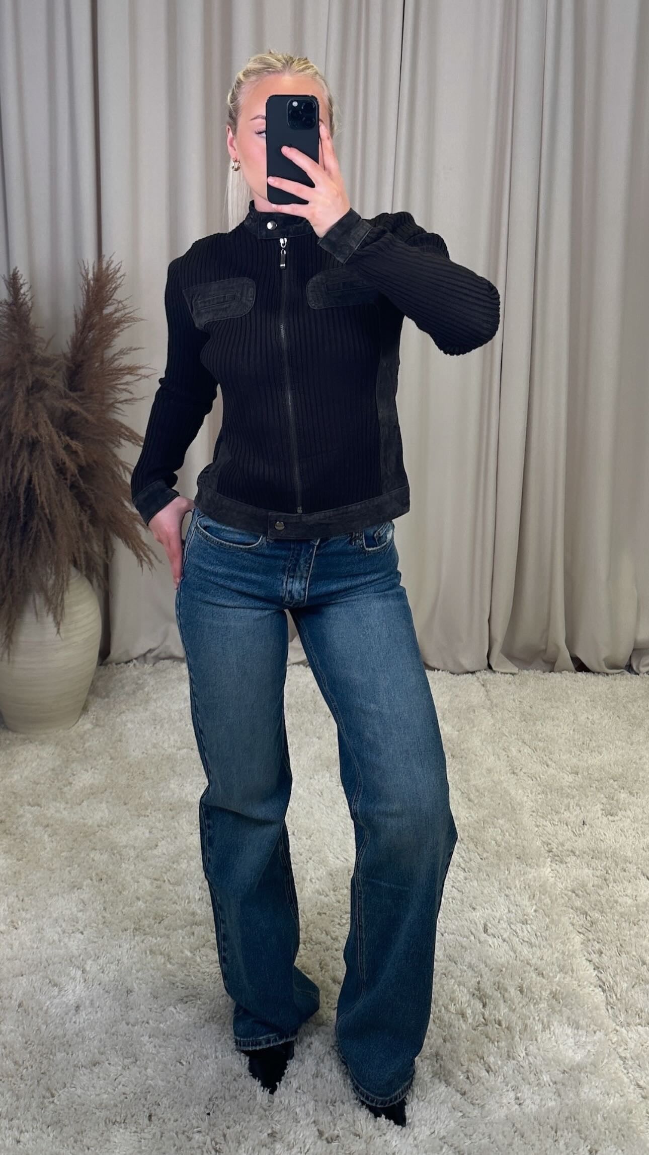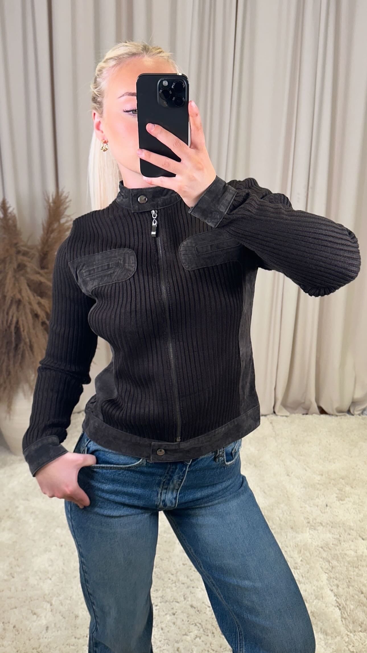 Æðislega flottur knit jakki með 100% ekta leðri, það er smá teygja í efninu og er true to size