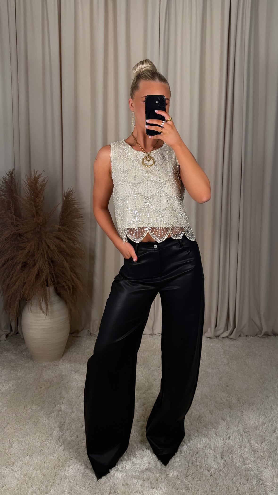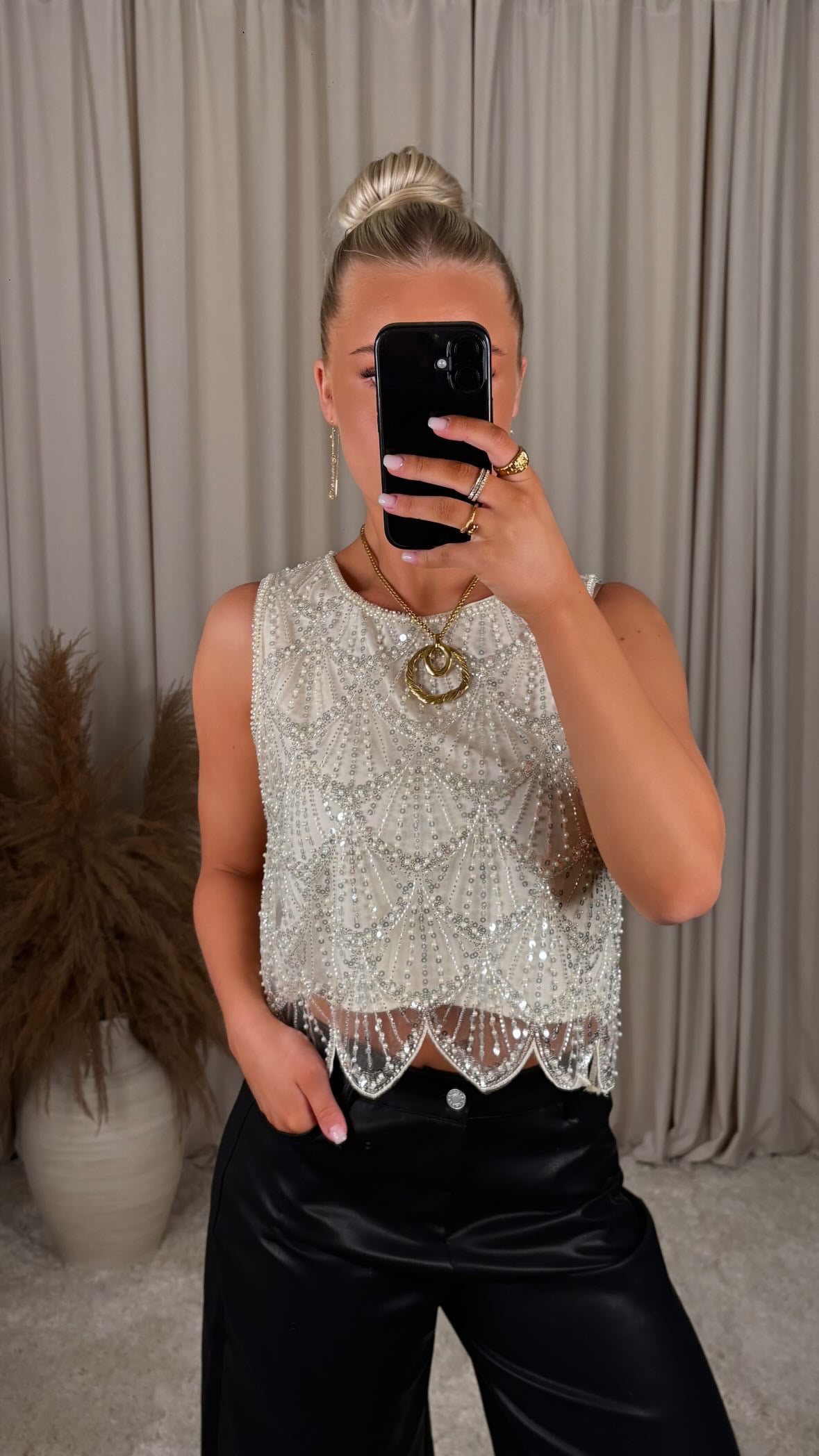 An incredibly beautiful sequined top made of very comfortable material, there is no stretch in the material and it has a button at the back of the neck.