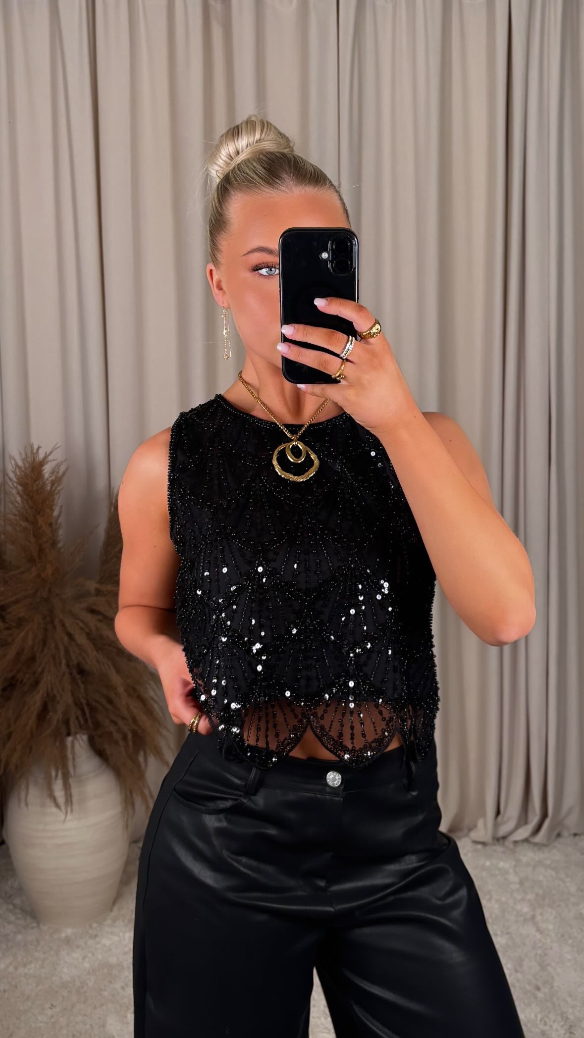 An incredibly beautiful sequined top made of very comfortable material, there is no stretch in the material and it has a button at the back of the neck.