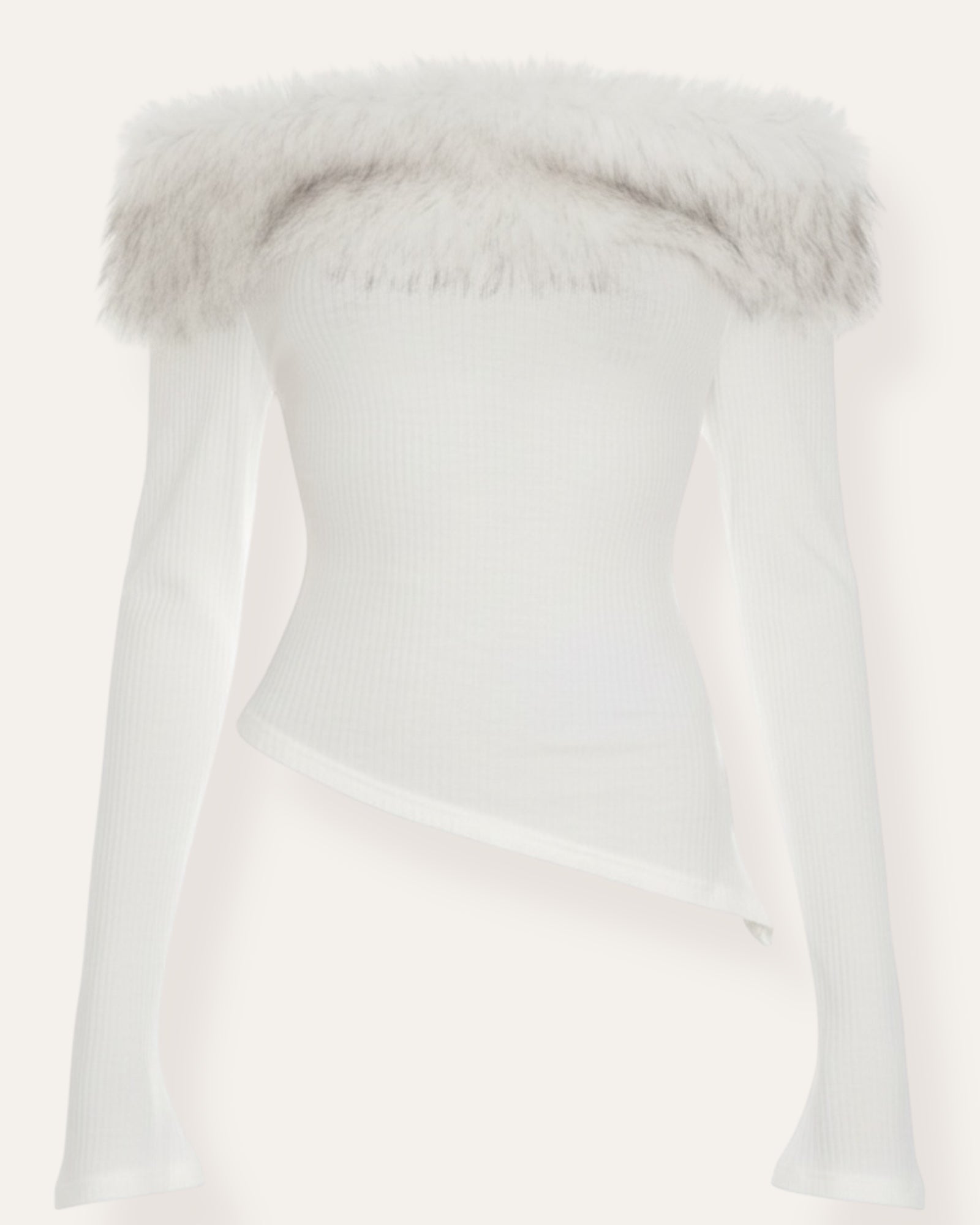 A ribbed, fitted off-shoulder top with a soft fur collar that gives an ultra feminine and luxe vibe. The irregular cut at the bottom adds an extra twist to the look and shapes a beautiful line.