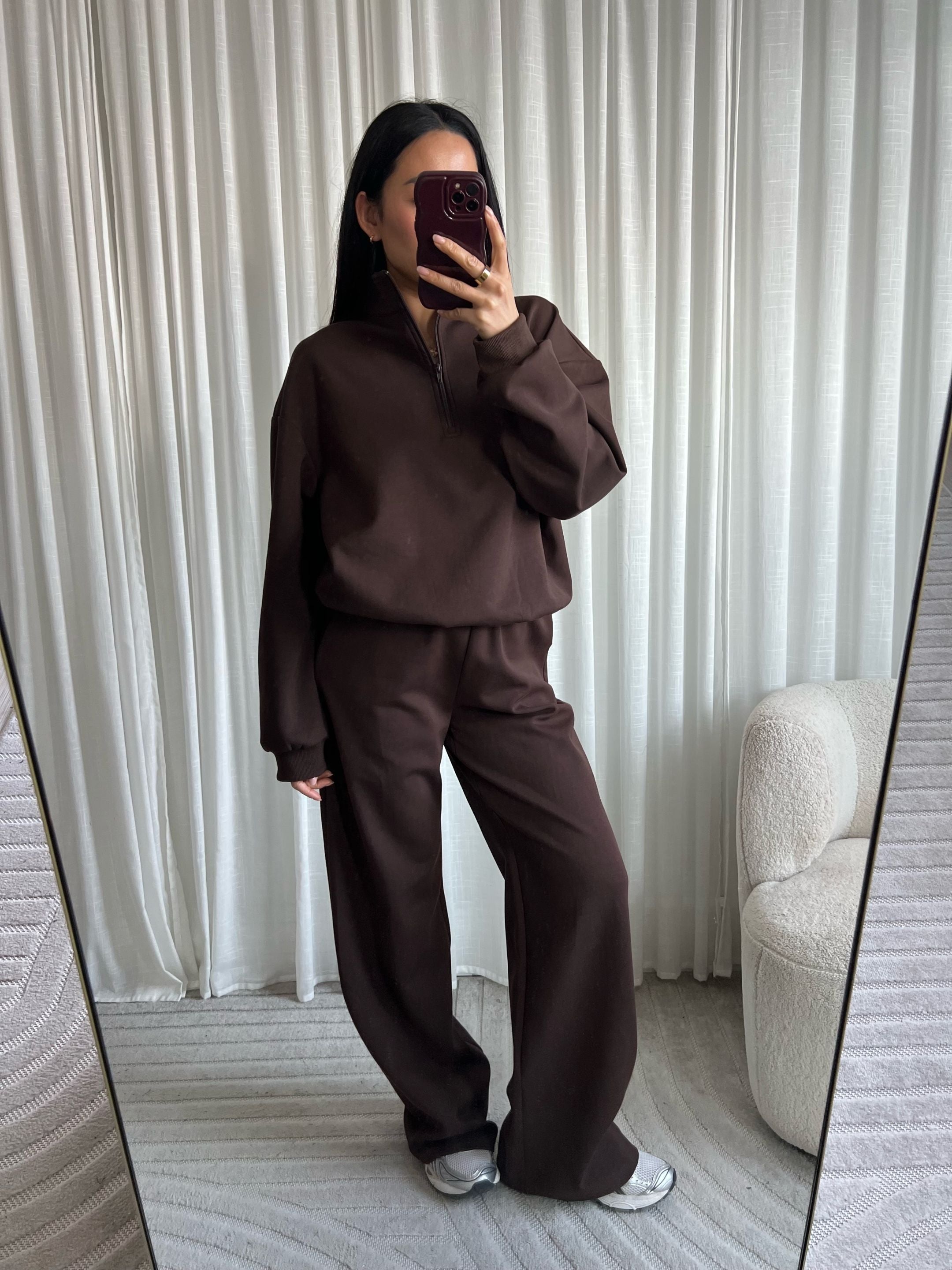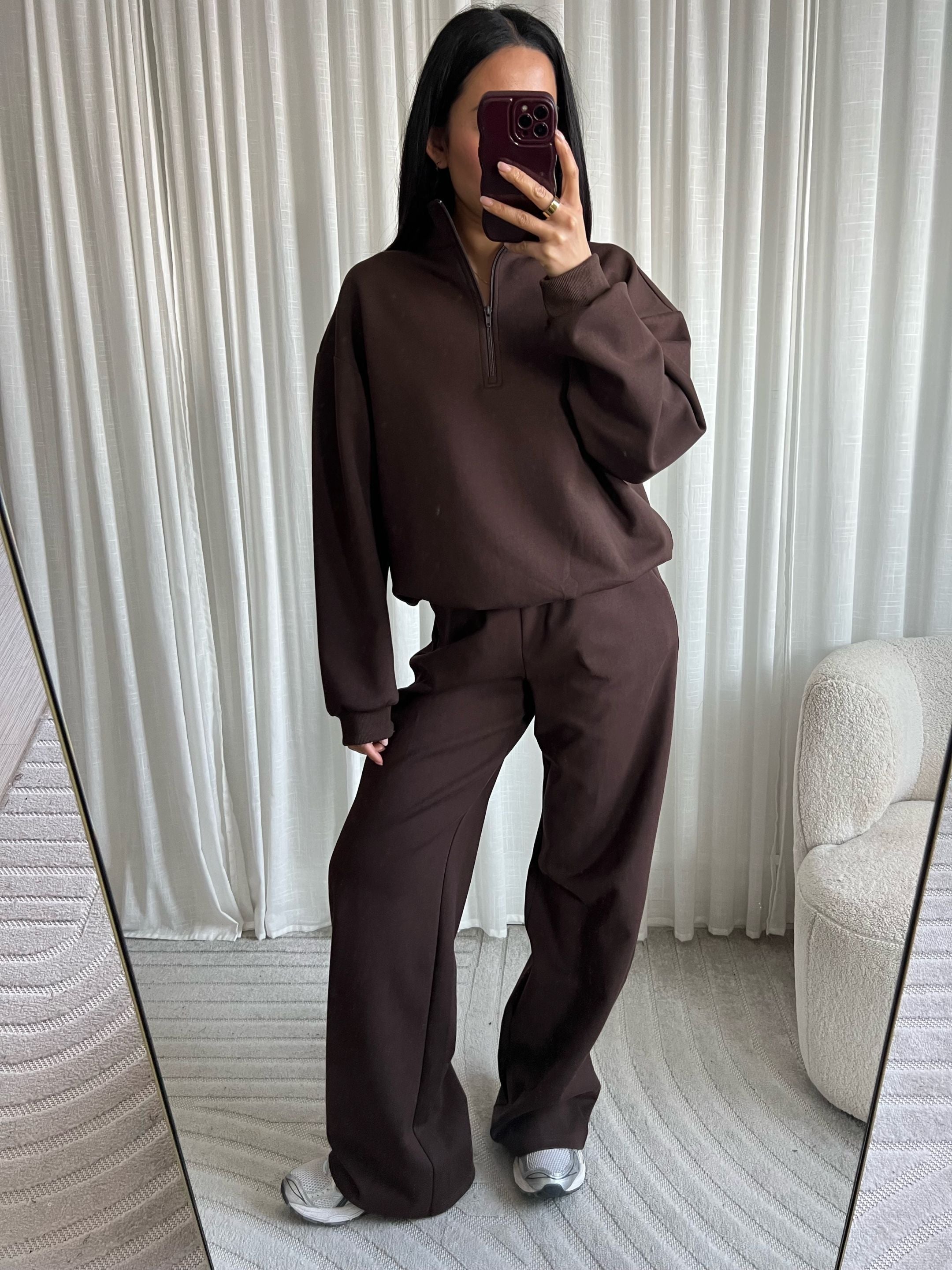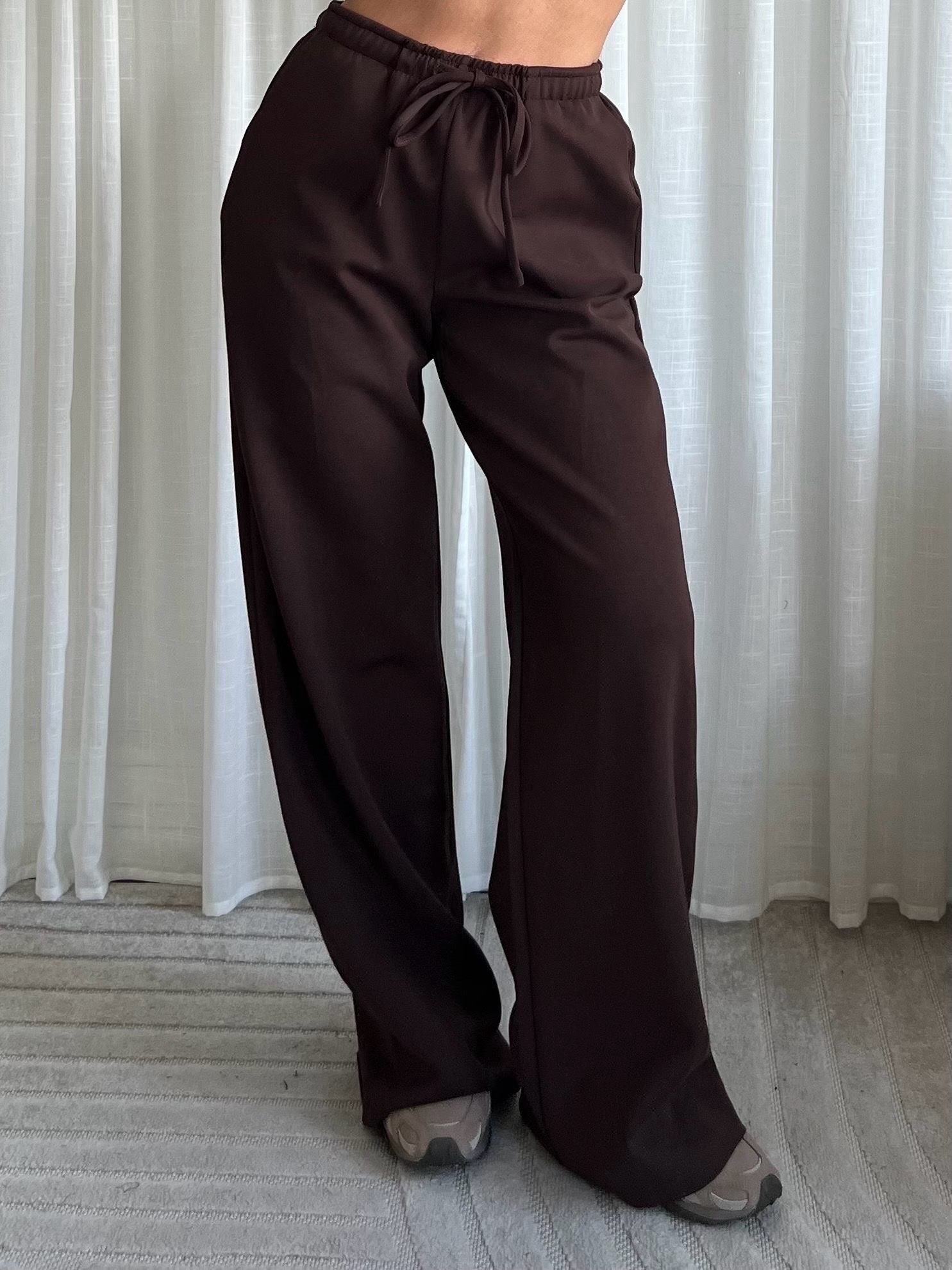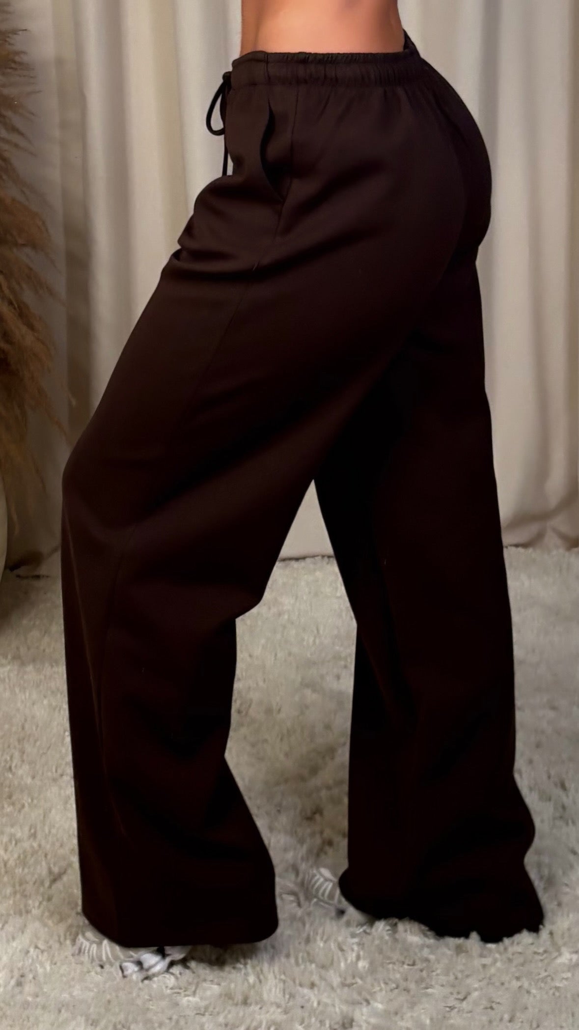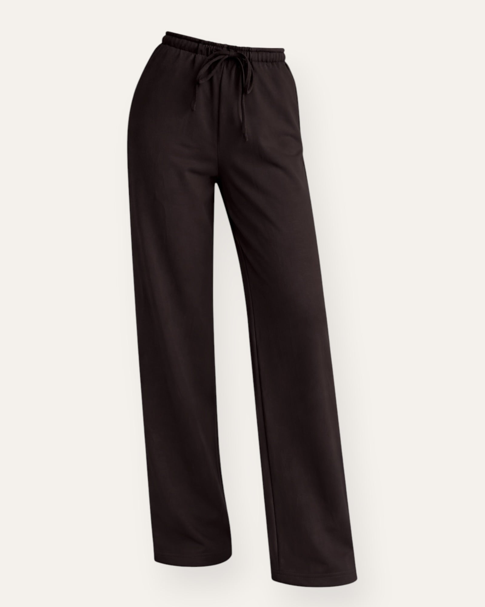 Efnið er mjúkt og þykkt með fallegu falli sem gerir buxurnar bæði kósý og chic – fullkomnar bæði heima og í styled outfit.