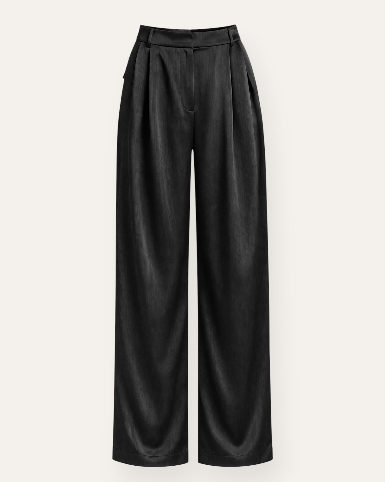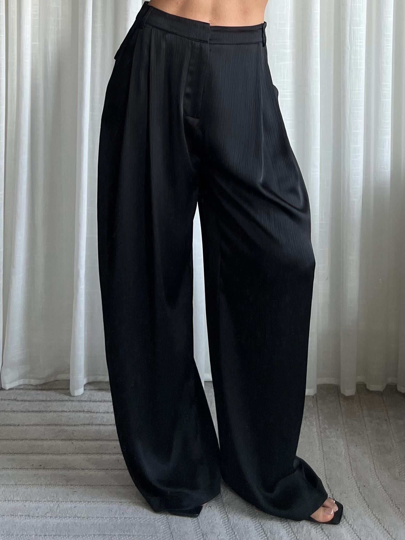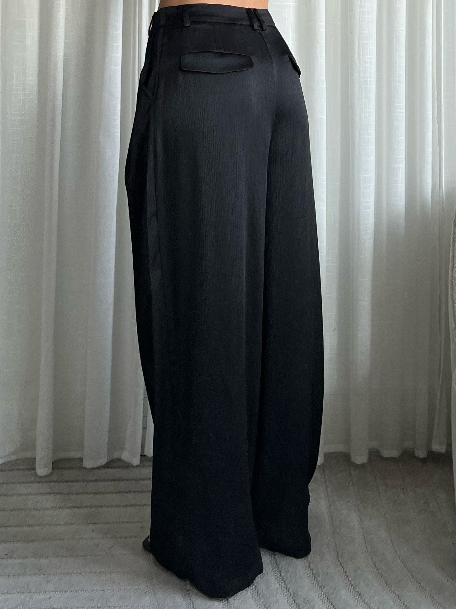 Elegant og effortless satín buxur sem gefa lúxus yfirbragð með lágmarks fyrirhöfn. Buxurnar eru í víðu, oversized sniði með fallegu falli sem hreyfist mjúklega með líkamanum. Midwaist mitti situr þægilega á mjöðmum og skapar afslappað en chic look.
