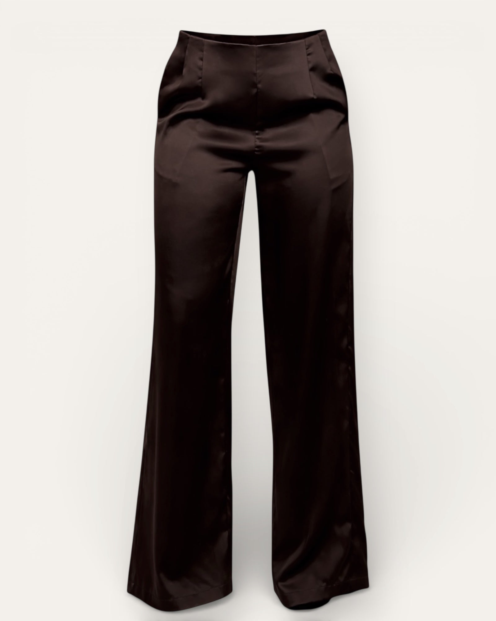 These satin pants are a must-have this season. They have a high waist and a wide cut that elongates the lines and gives an effortless, chic look. The shiny satin finish gives a luxurious feel while the cut is clean and minimal.