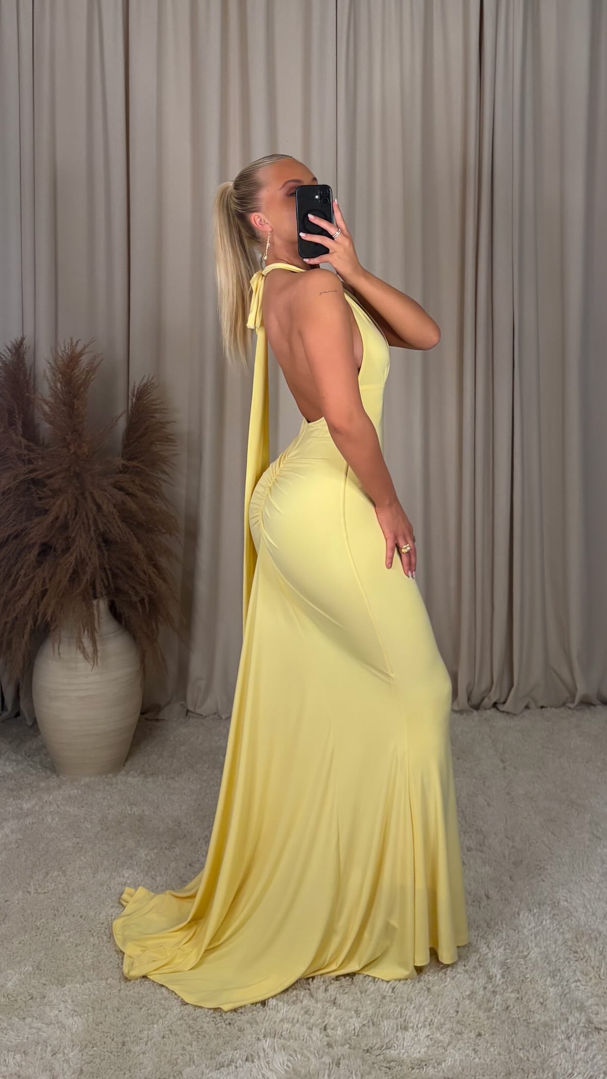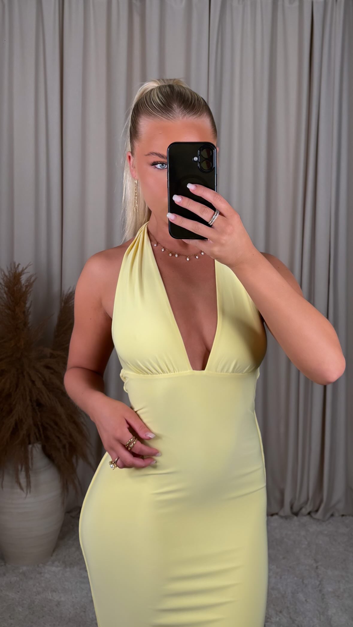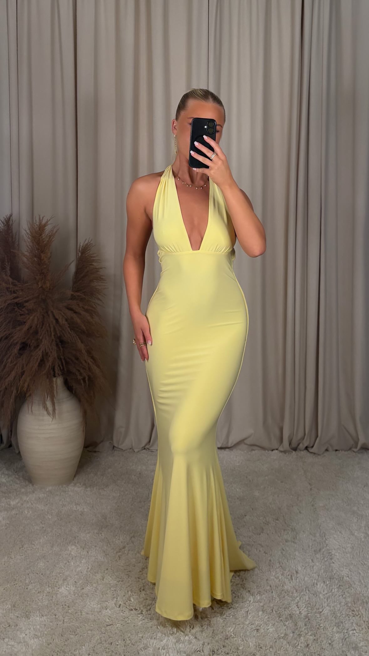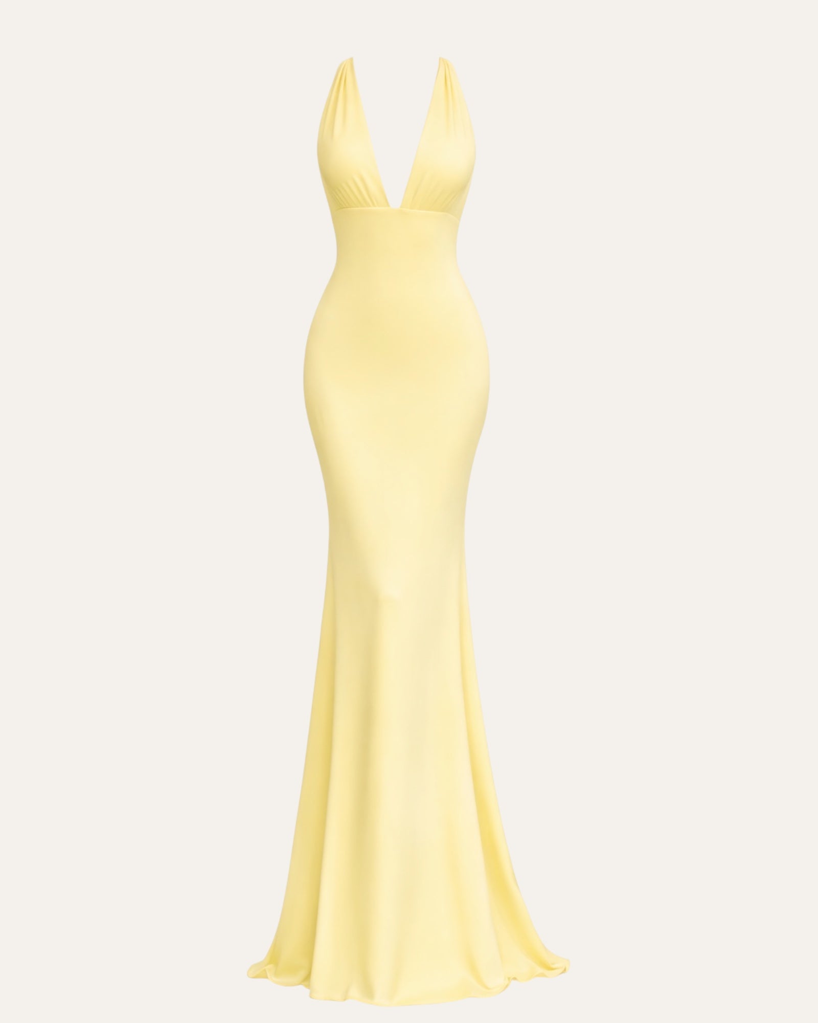 A gorgeous and timeless maxi dress in a beautiful buttery yellow color. A deep V-neckline and underbust seam create a beautiful line at the top of the dress while the cut flows smoothly into a long, flowing skirt. The fabric is stretchy and comfortable, and drapes beautifully against the body. Perfect for weddings, graduations, summer parties, or other festive occasions.