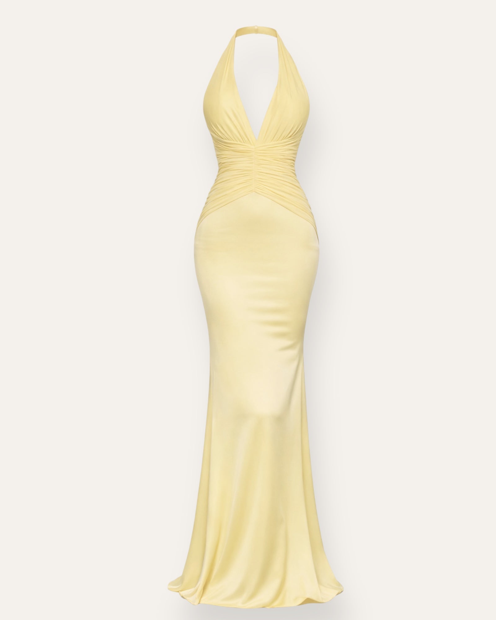 A stunning halter maxi dress with a deep v-neck and beautiful ruching at the waist that shapes the body in a uniquely flattering way. A tailored fit that falls softly into a long, flowing skirt and elongates the line for an elegant and dramatic look.