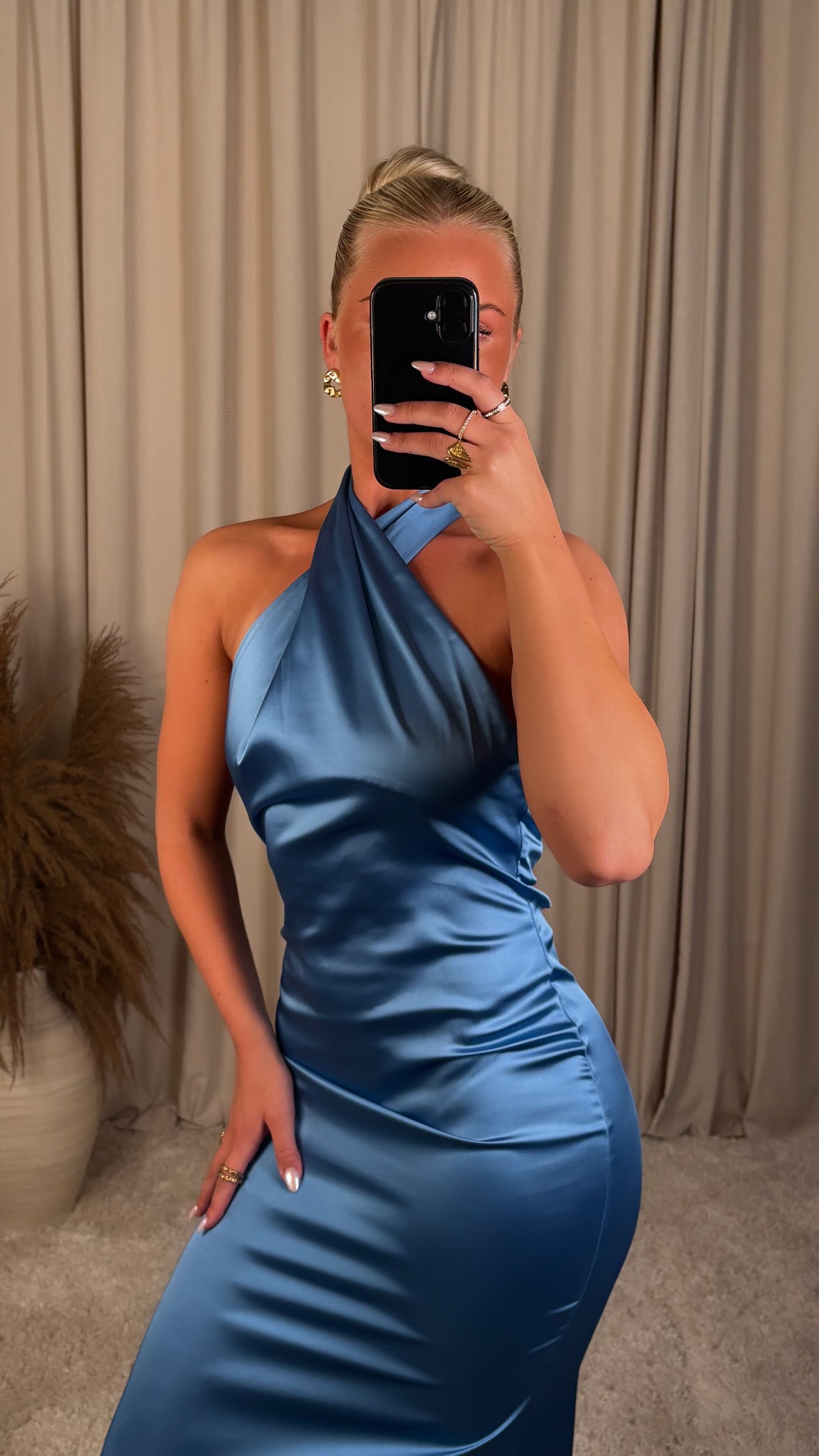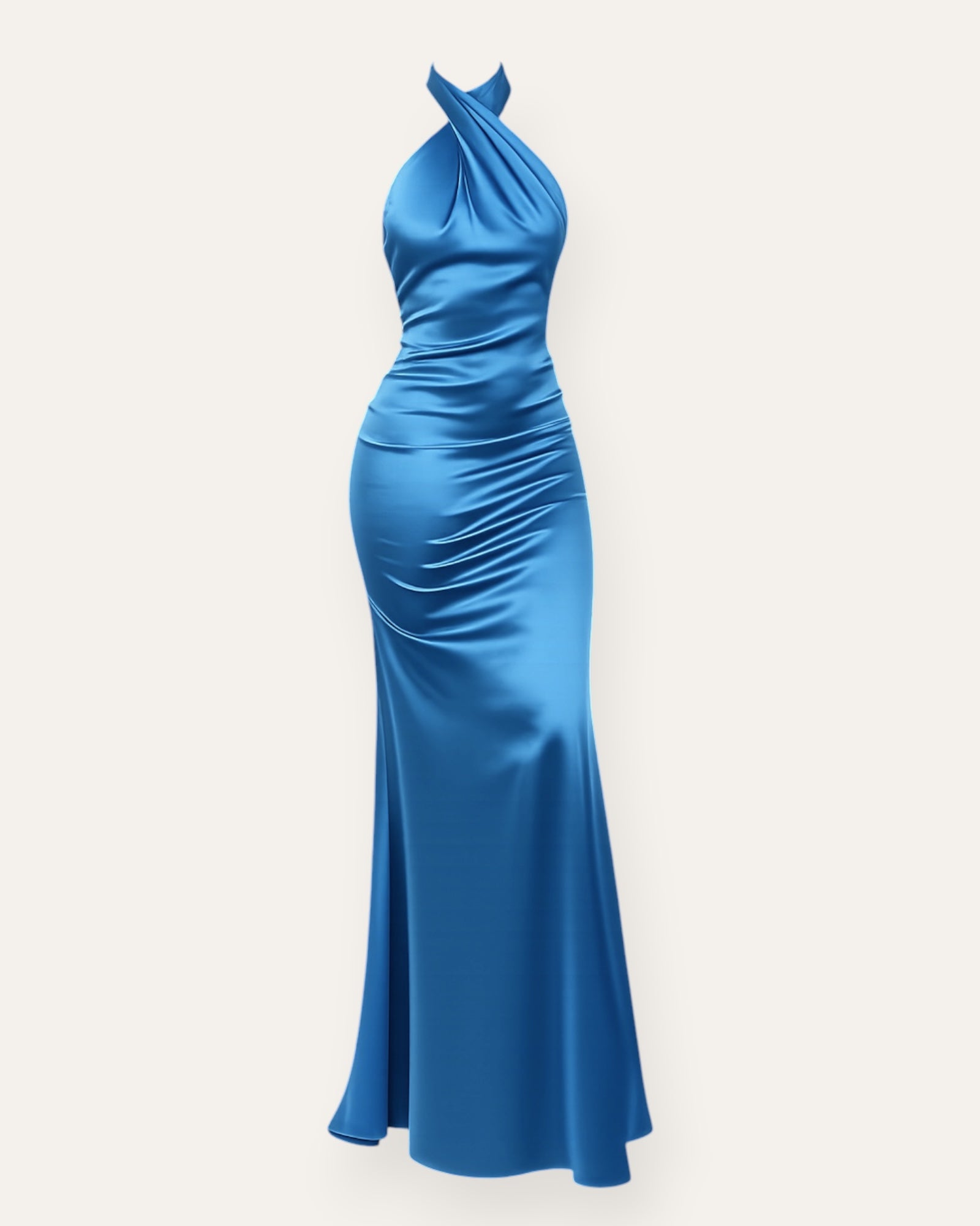 Glæsilegur satínkjóll sem fellur fallega að líkamanum og skapar elegant siluettu. Hálsmálið er krossað (halter) sem gefur kjólnum fágað og nútímalegt útlit, á meðan opið bak bætir við smá kynþokka. Fullkominn fyrir veislur, brúðkaup og útskriftir – kjóll sem lætur þig skína á stórum degi.