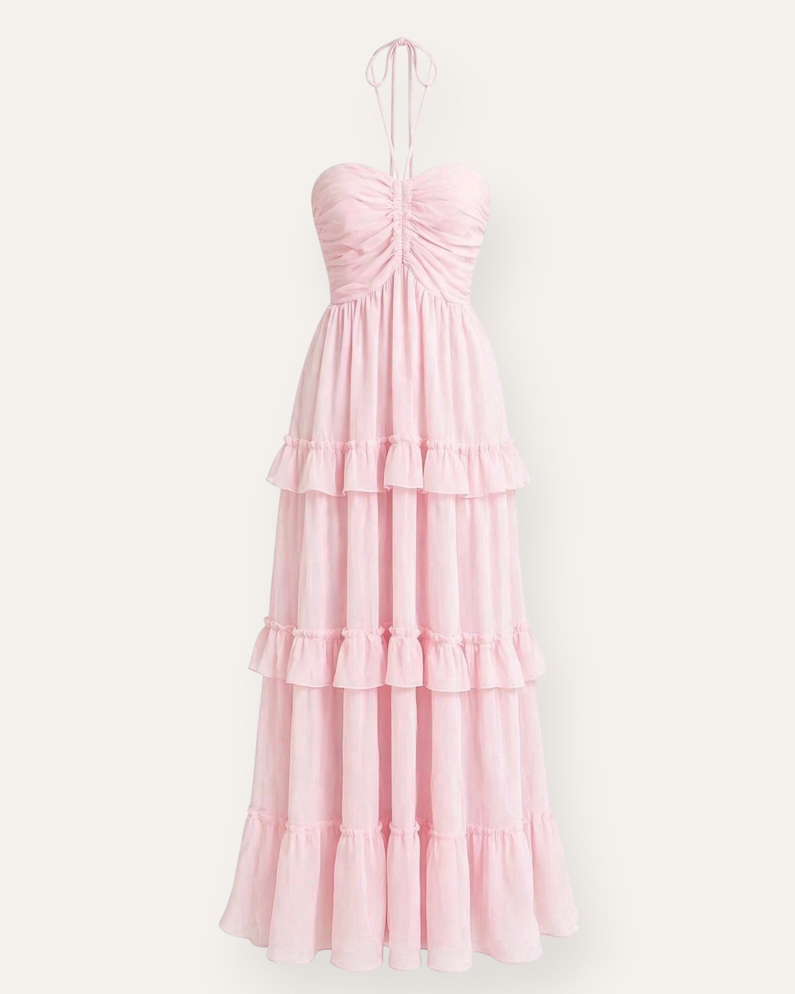 Léttur og kvenlegur kjóll með fallegum rykkingum og lögum sem skapa mjúka og flæðandi hreyfingu. Toppurinn mótar fallega yfir brjóstið og böndin yfir hálsinn gefa honum fínlegt og sumarlegt yfirbragð.