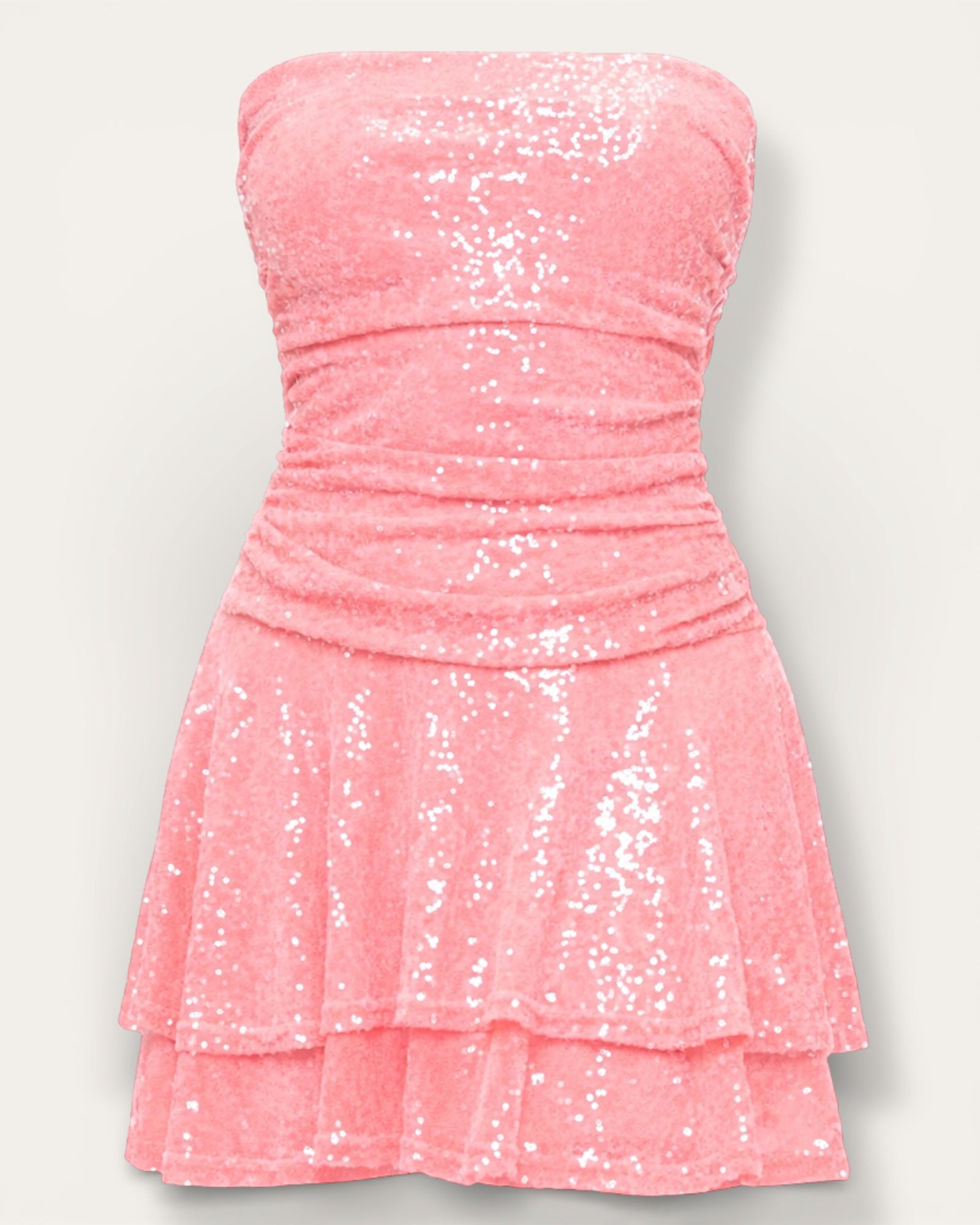 A beautiful and feminine mini dress with an off-shoulder / strapless design that fits snugly and beautifully shapes the waist. A little ruching over the stomach area gives an extra flattering shape and the double sequined fabric sparkles beautifully in the light.