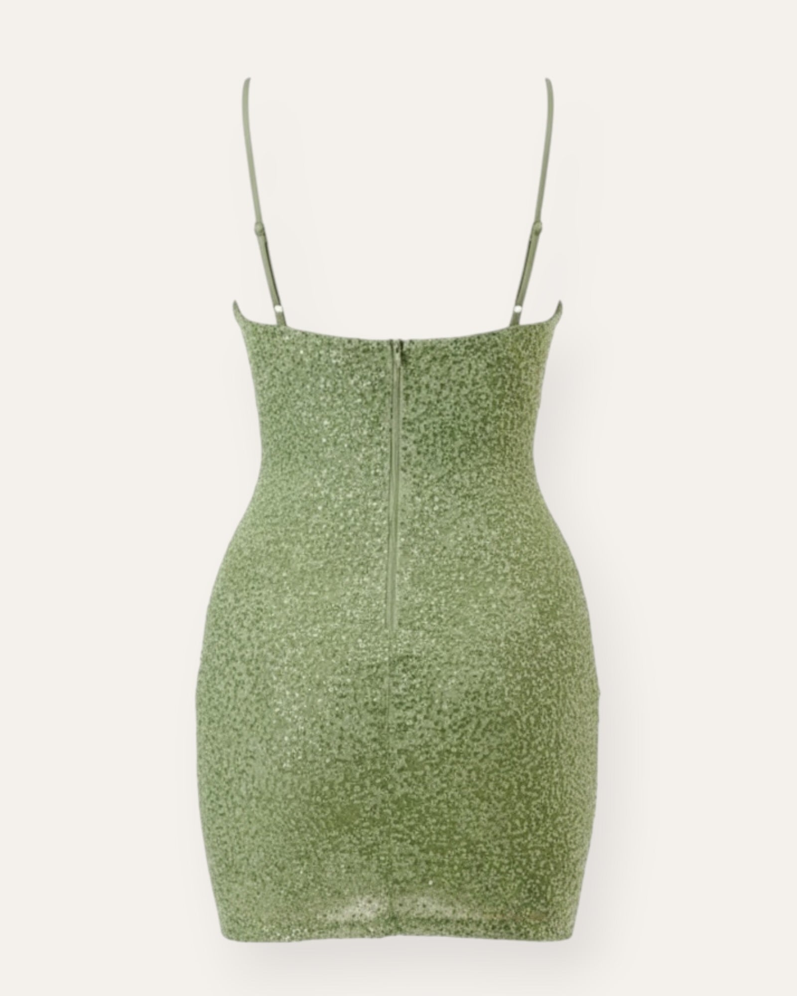 Stuttur, aðsniðinn kjóll þakinn fíngerðum perlum sem gefa fallegt glitrandi og lúxus áferð. Mjúkt hálsmál og mjóar stillanlegar hlýrar skapa kvenlegt og elegant look, á meðan sniðið mótar líkamann á fallegan hátt.