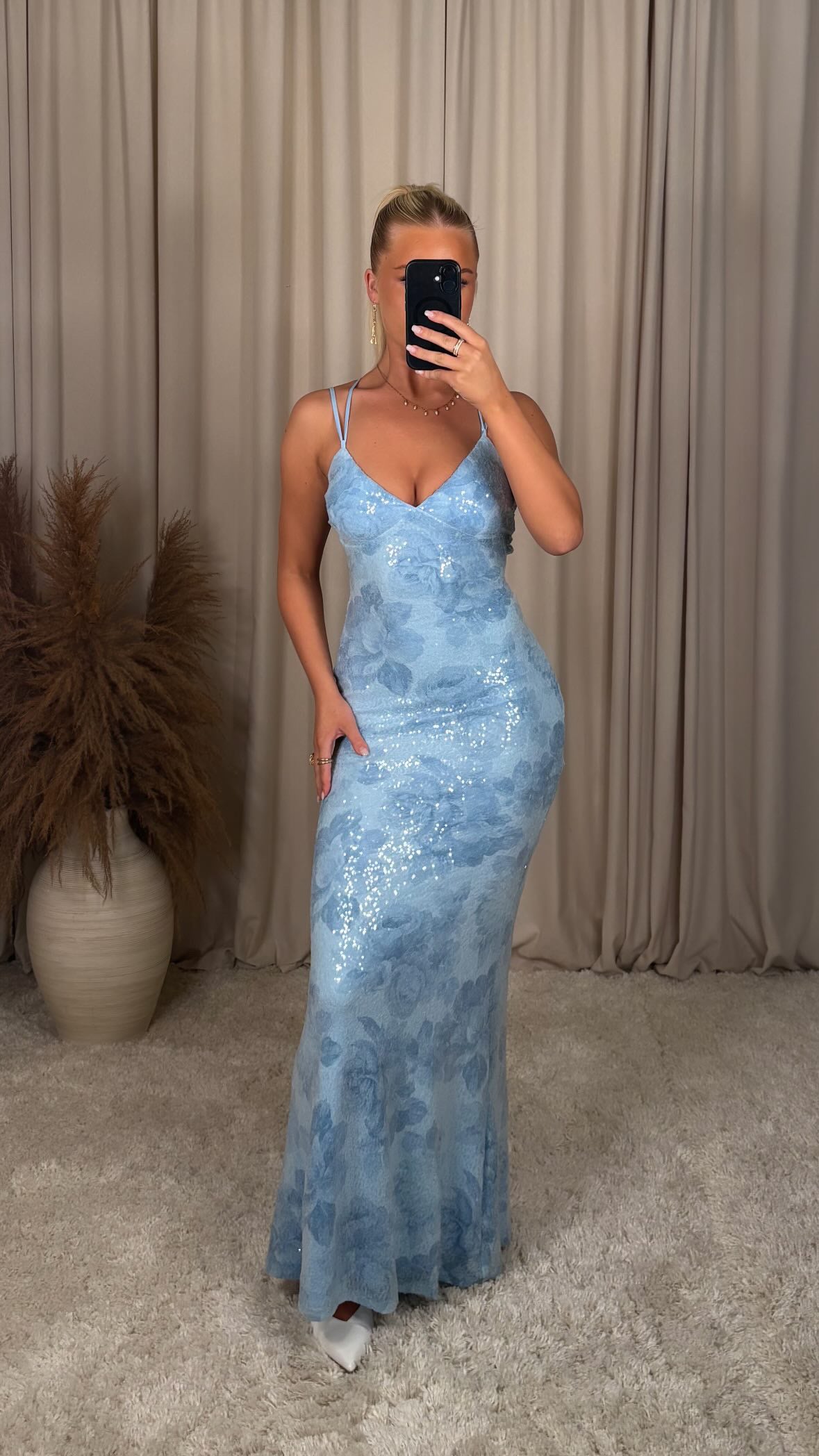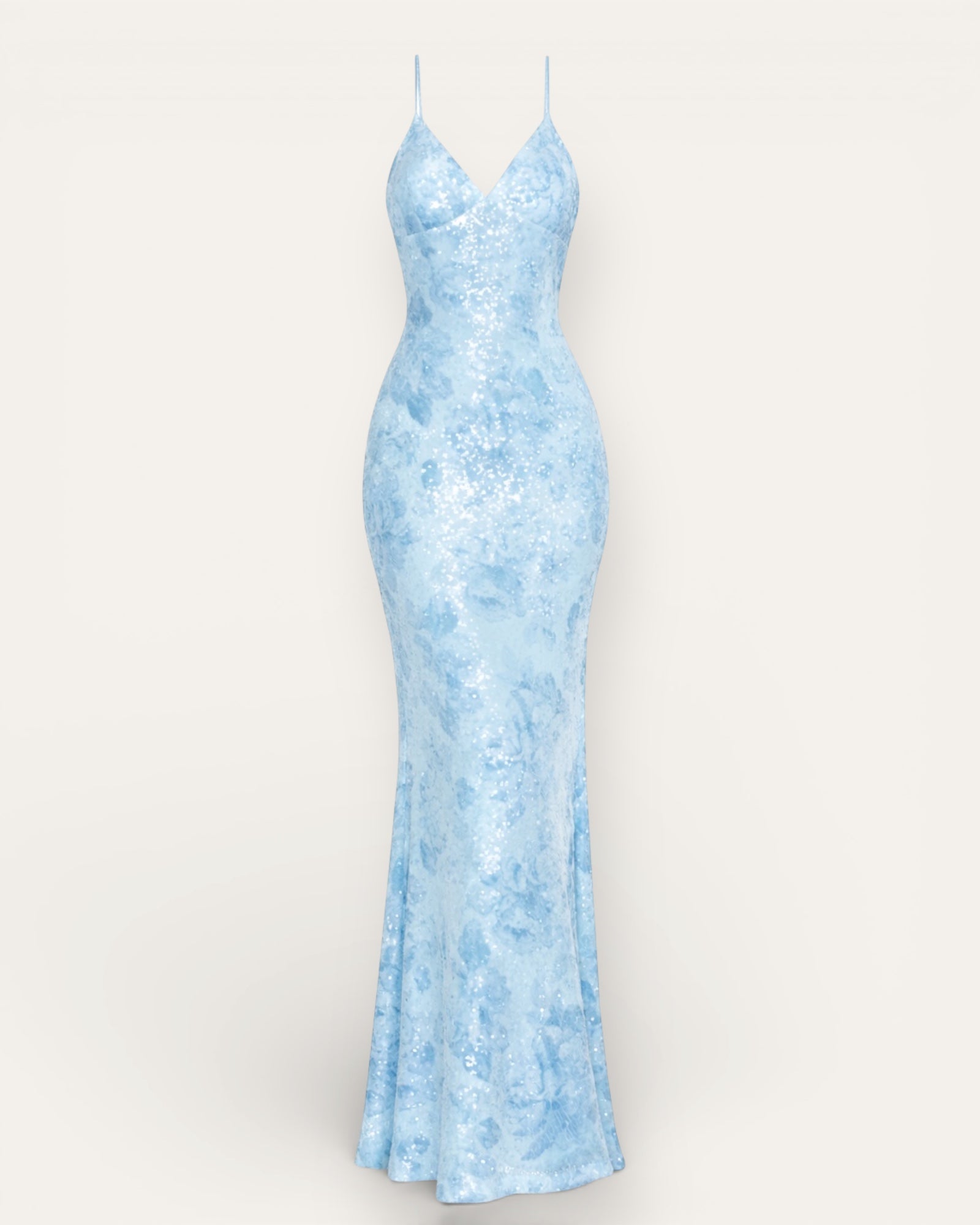 A beautiful maxi dress with sparkling sequins and a soft floral pattern. The fitted cut beautifully shapes the body and the V-neckline with narrow sleeves gives an elegant look.