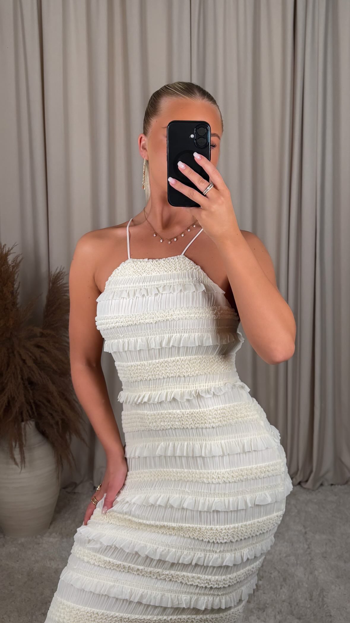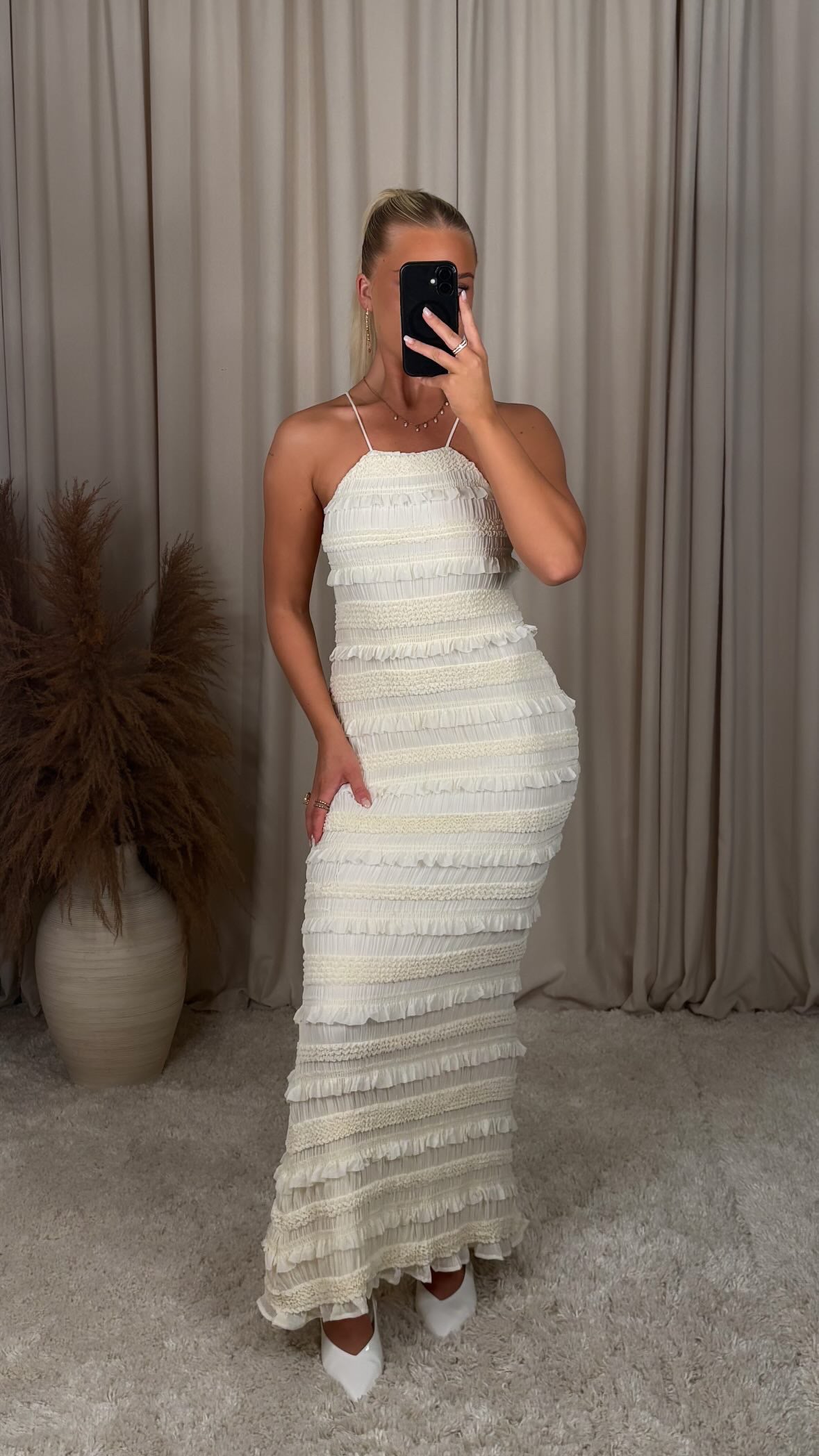 A fitted maxi dress with ruching that shapes the body in an incredibly flattering way and hugs softly in all the right places. Stretchy material that keeps you both comfortable and stylish.