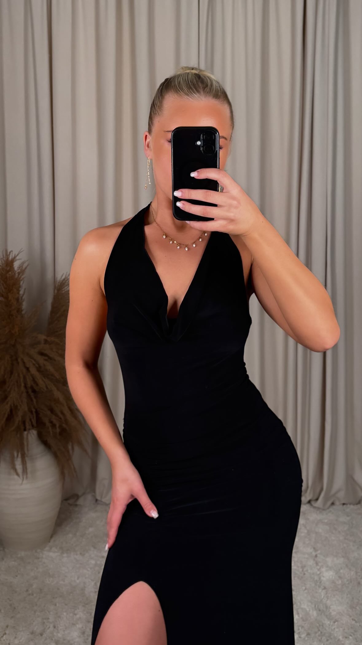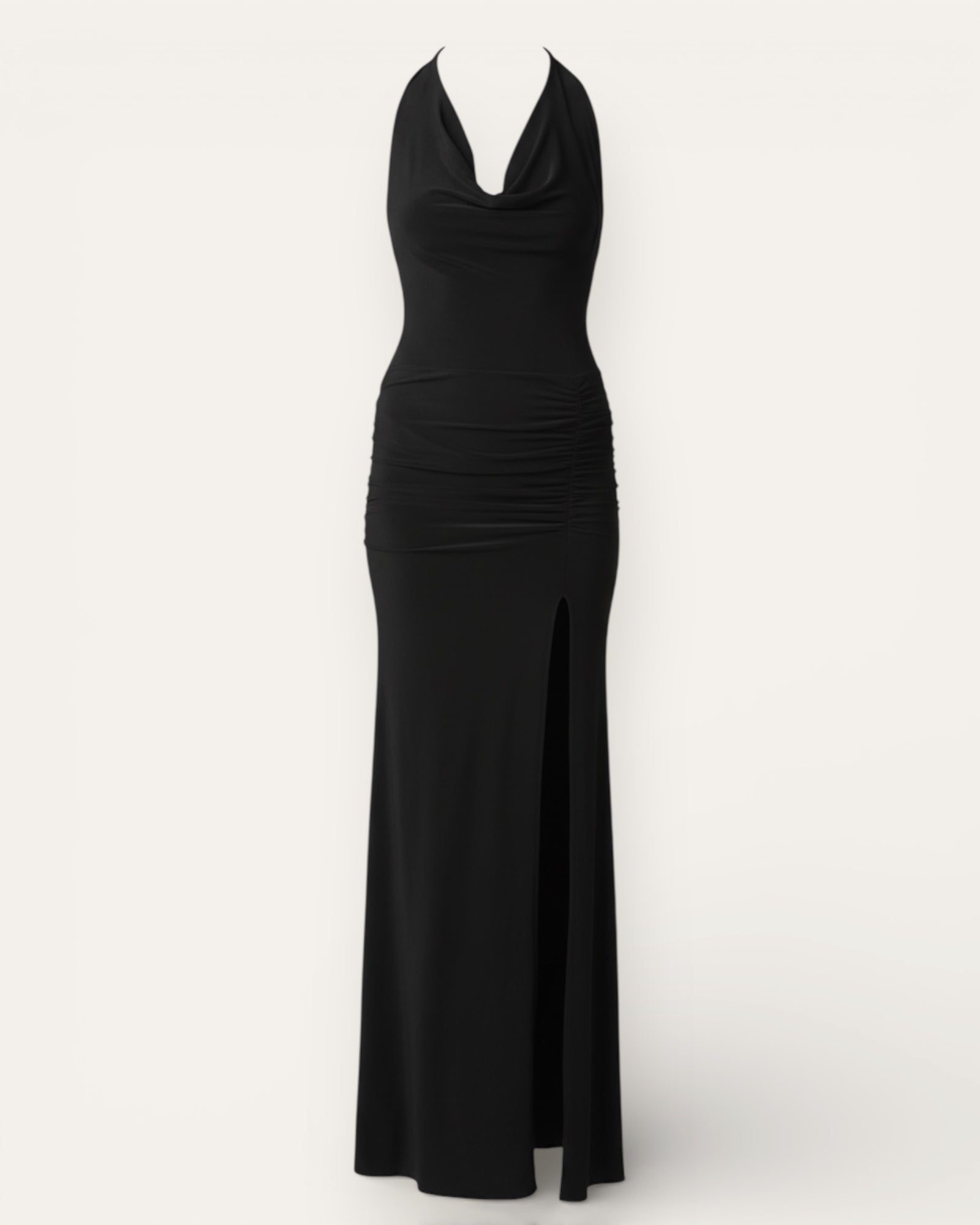 The dress has a halter neckline that ties at the back, creating a beautiful open back. Soft, stretchy fabric and ruching over the waist and hips shape the body in a tasteful way. A side slit on the skirt gives beautiful movement and a feminine touch.