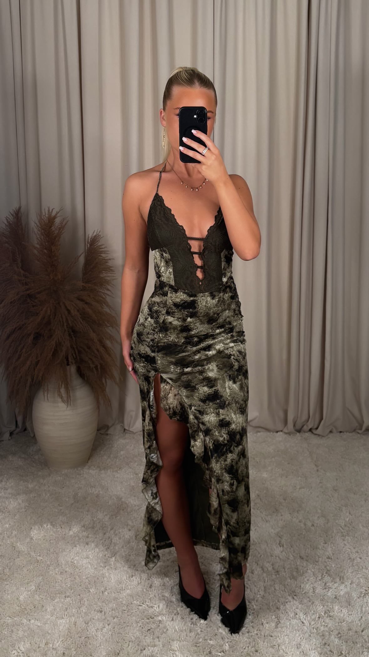 Stunning maxi dress in a beautiful olive pattern with a lace halter top and a deep neckline. Light mesh material with beautiful ruching and a slit at the front that gives the dress movement and sexiness. Perfect for outings, summer parties, vacation or special occasions where you want to stand out.