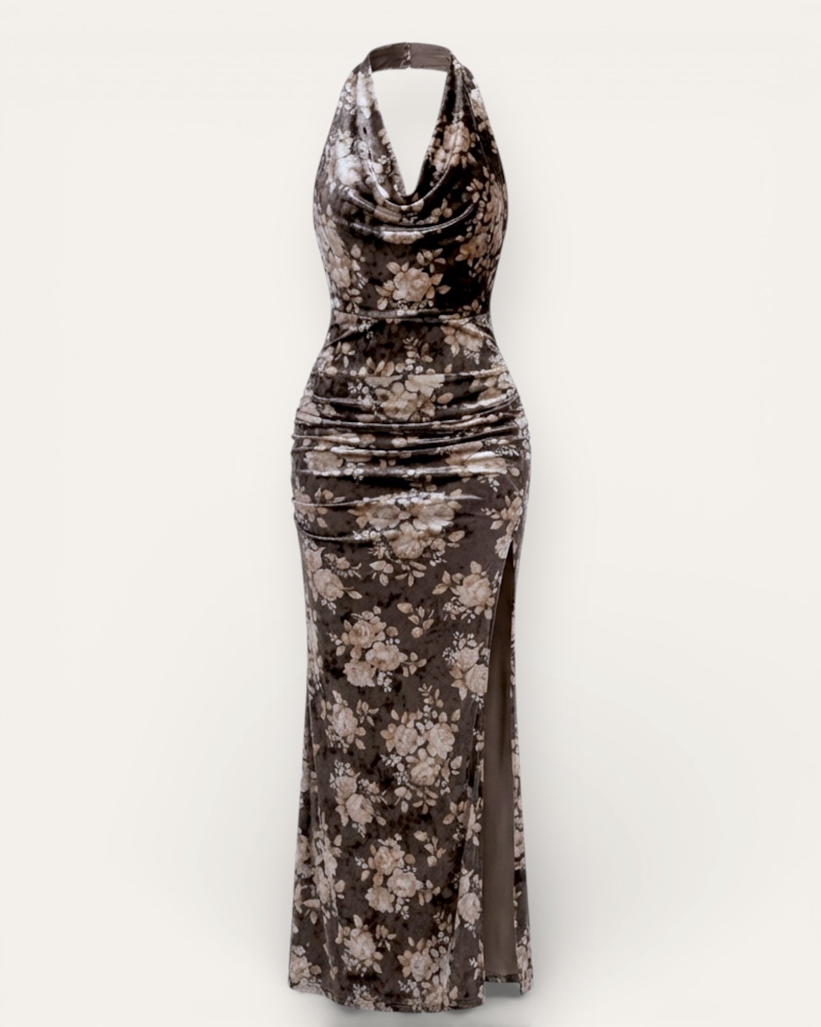 A gorgeous maxi dress made of soft, stretchy velour with a beautiful floral pattern in warm mocha tones.