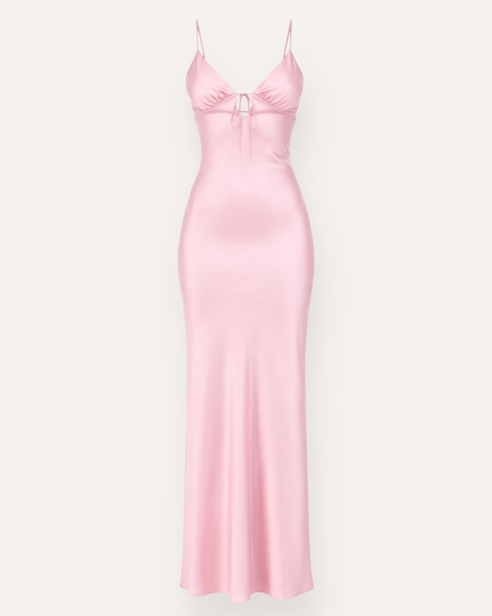 Glæsilegur satínkjóll með mjúku og fallegu falli. Kjóllinn er með þunnum hlýrum, V-hálsmáli með bandi að framan og opnu baki sem gefur honum kvenlegt og elegant útlit.