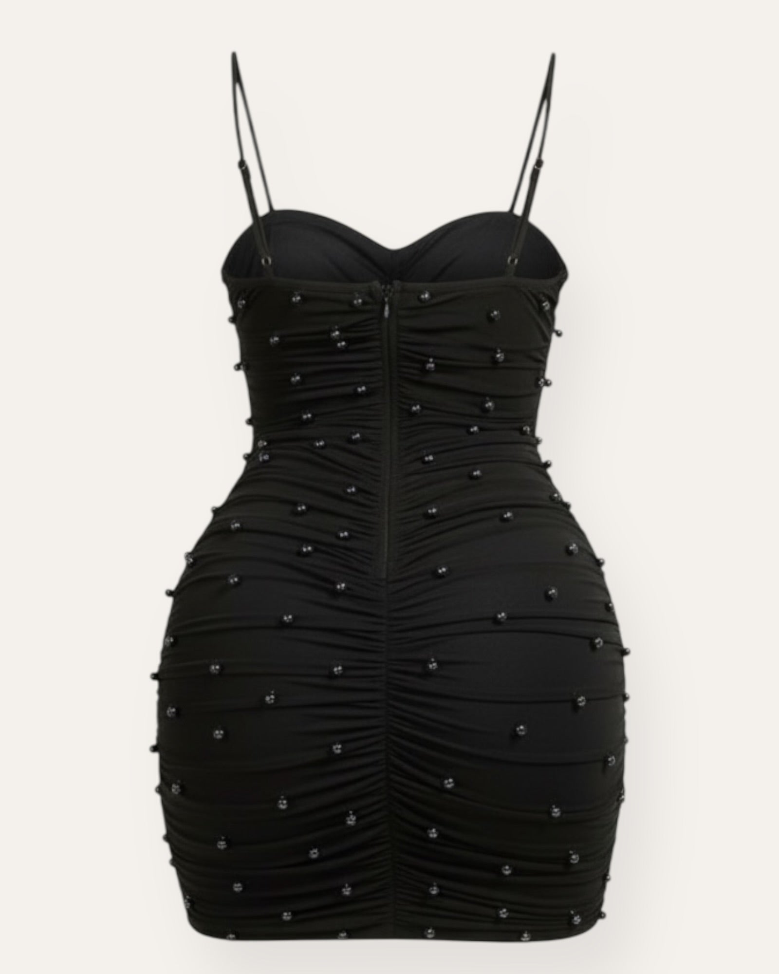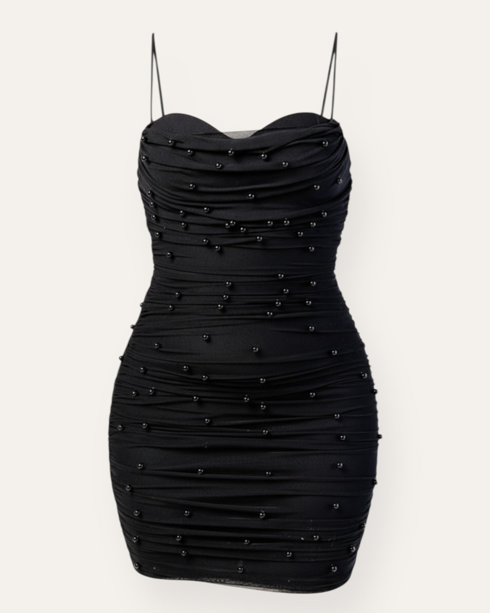 Glæsilegur og kvenlegur mini kjóll með fallegum fellingum og litlum perlum sem gefa kjólnum elegant og sérstakt útlit. Kjóllinn er með þunnum stillanlegum hlýrum og fallegu sniði sem mótar líkamann.