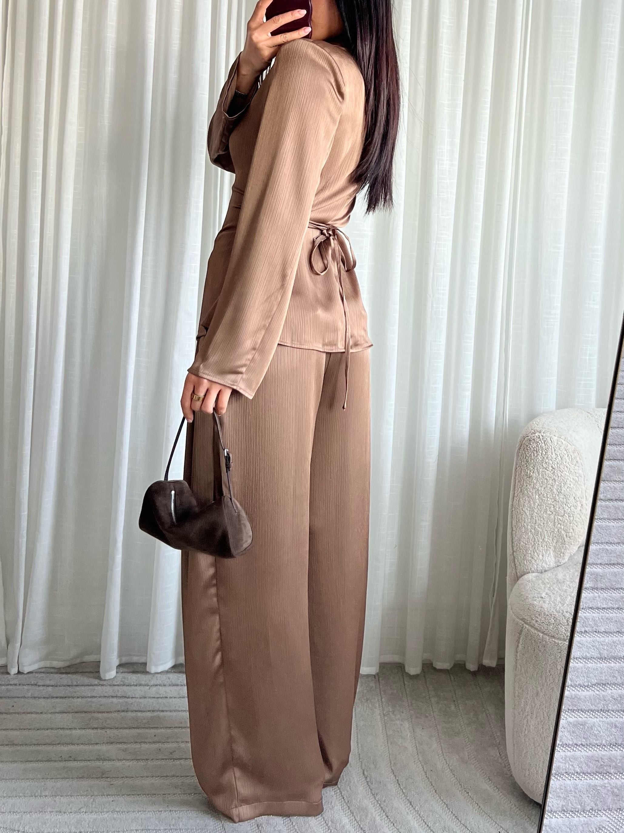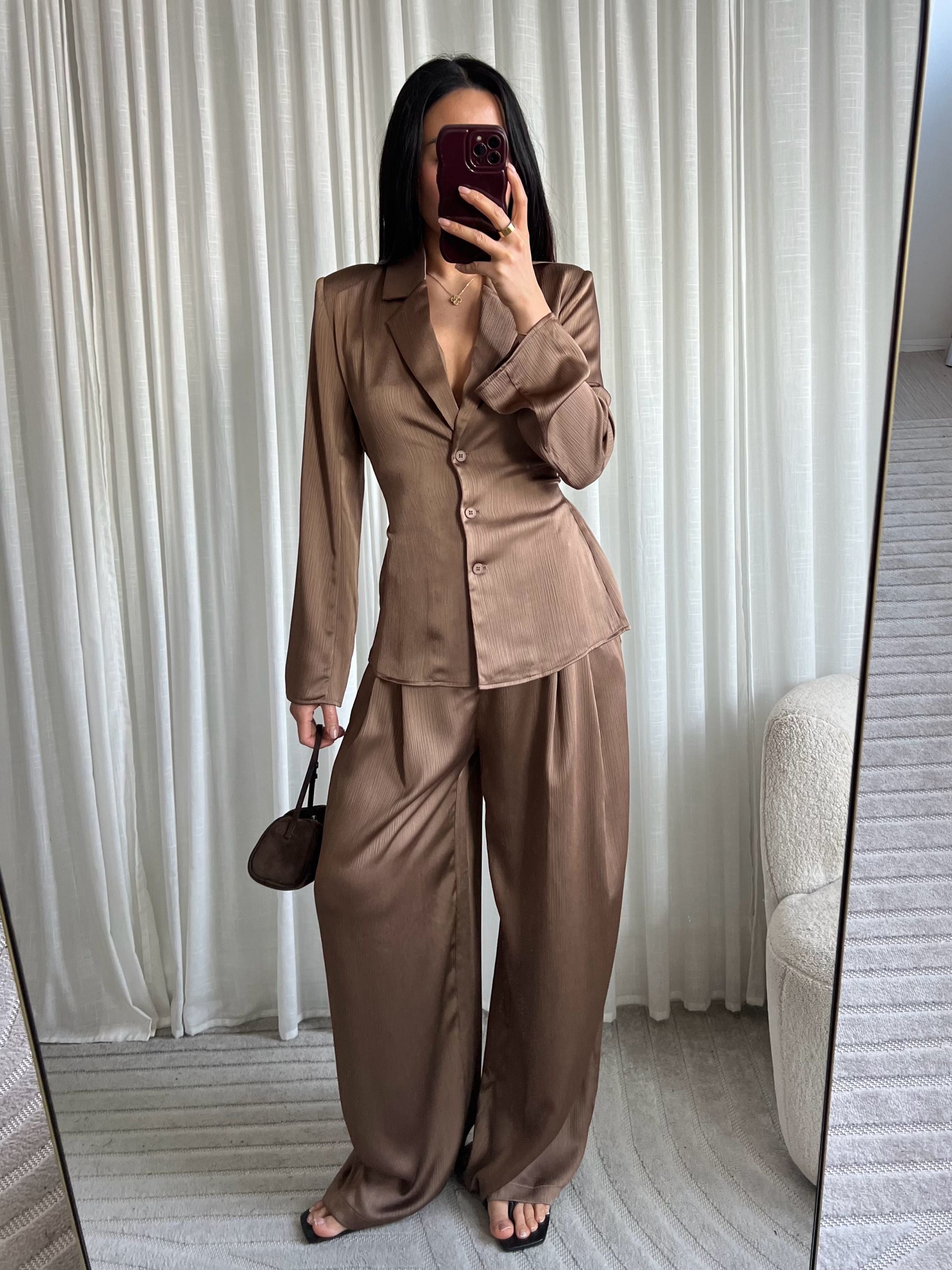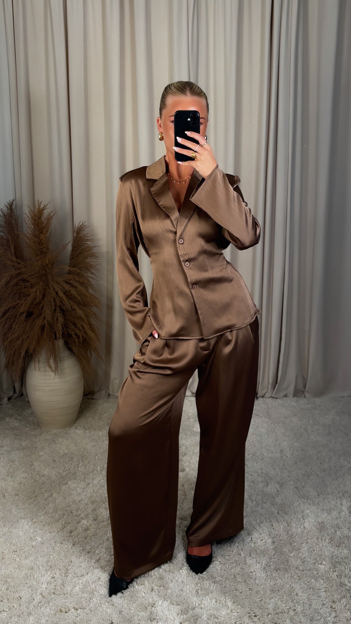 Efnið er létt, mjúkt og með fallegum glans sem gefur lúxus yfirbragð – fullkomið bæði við tilefni og hversdags þegar þú vilt vera extra chic.