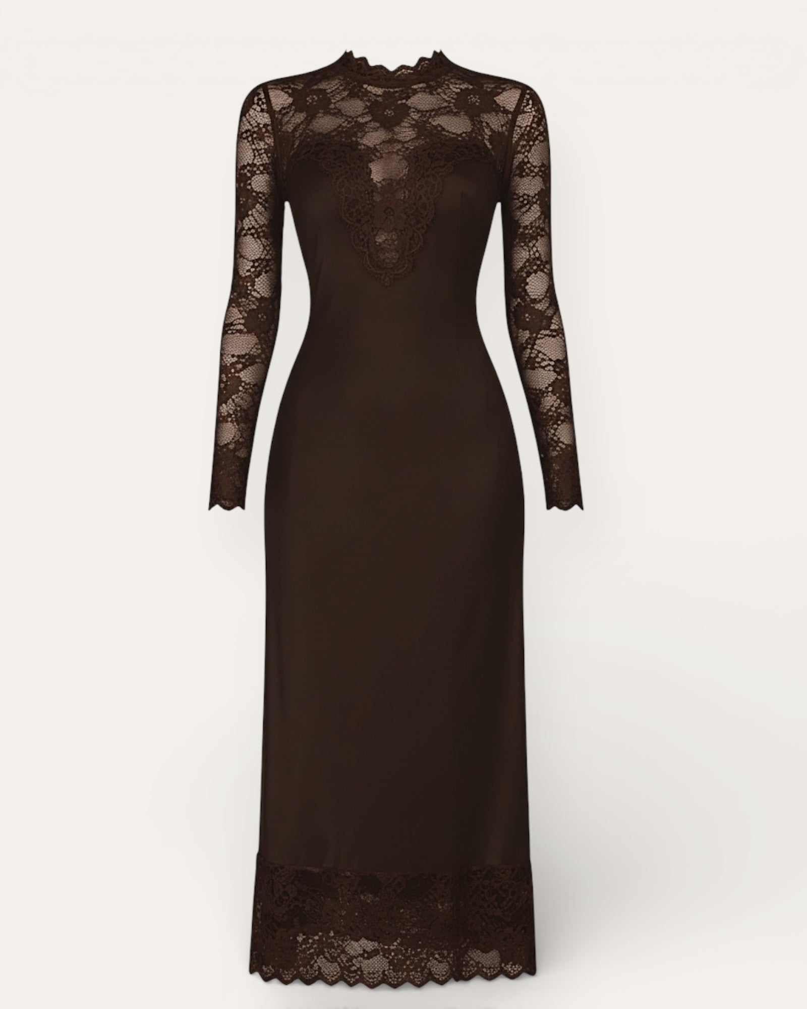 An incredibly beautiful lace dress made of very comfortable satin material, there is no stretch in the material and has a zipper at the back.