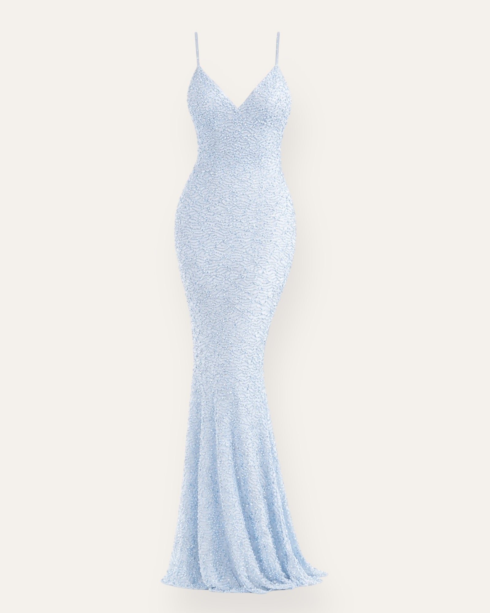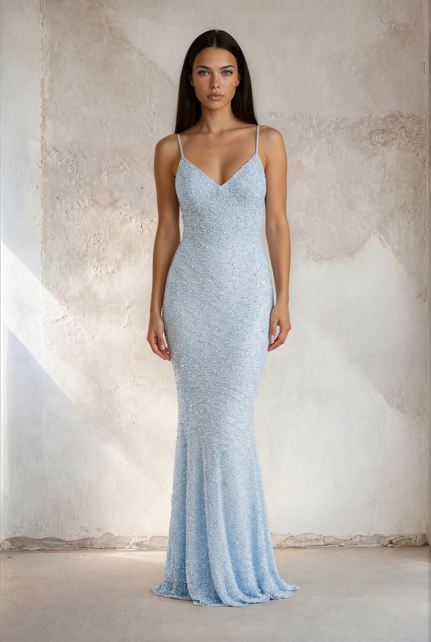 Þessi glæsilegi maxi kjóll er fullkominn fyrir sérstök tilefni þar sem þú vilt skína ✨ Kjóllinn er þakinn fíngerðum litlum perlum og glærum steinum sem gefa honum fallegan shimmer og lúxusáferð sem grípur ljósið á hverju skrefi.