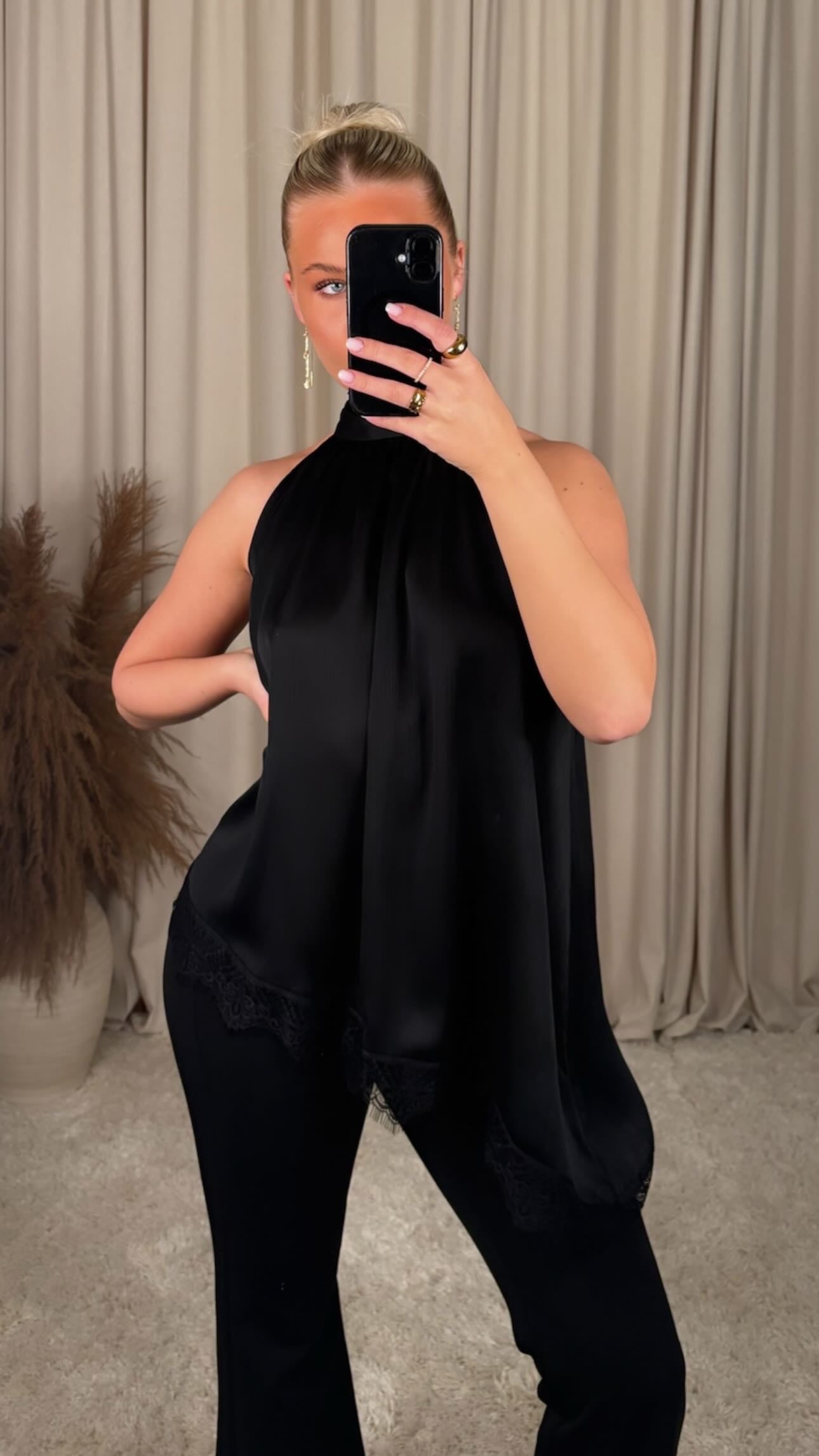 Æðislega fallegur bolur úr mjög mjúku satín efni, bolurinn er léttur og þæginlegur, og er bundin að aftan